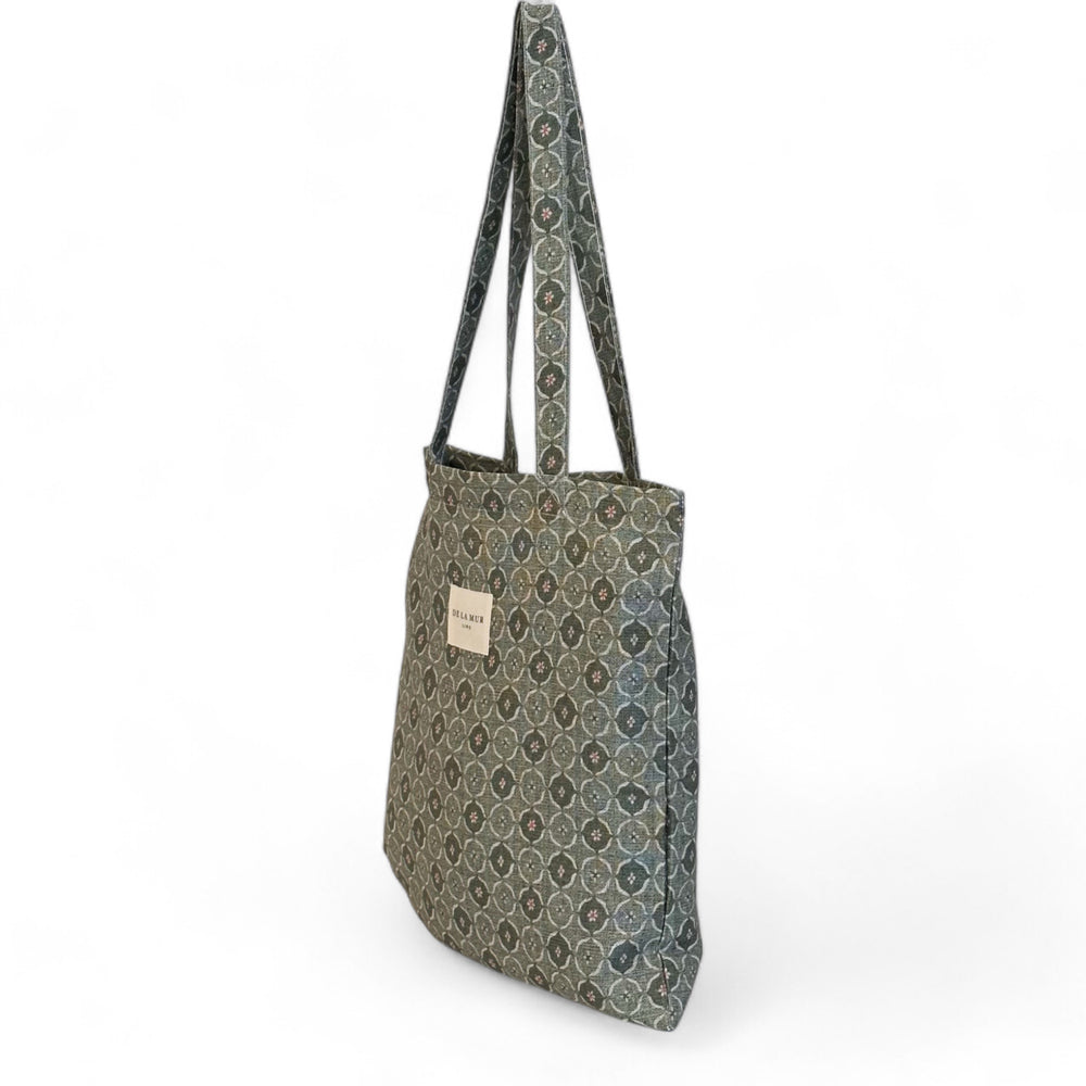 Bolsa "tote bag" con asas para llevar al hombro. Con tejido fino de half-panama con estampado geométrico en tonos verdes. Para su correcto mantenimiento se aconseja lavarlo en frío y no utilizar secadora.