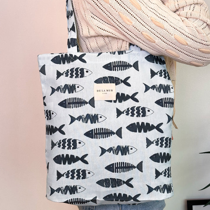 Bolsa “tote bag” con asas para llevar al hombro. Con un tejido con estampado de peces en tonos azules sobre fondo azul celeste. Para su correcto mantenimiento se aconseja lavarlo en frío y no utilizar secadora.