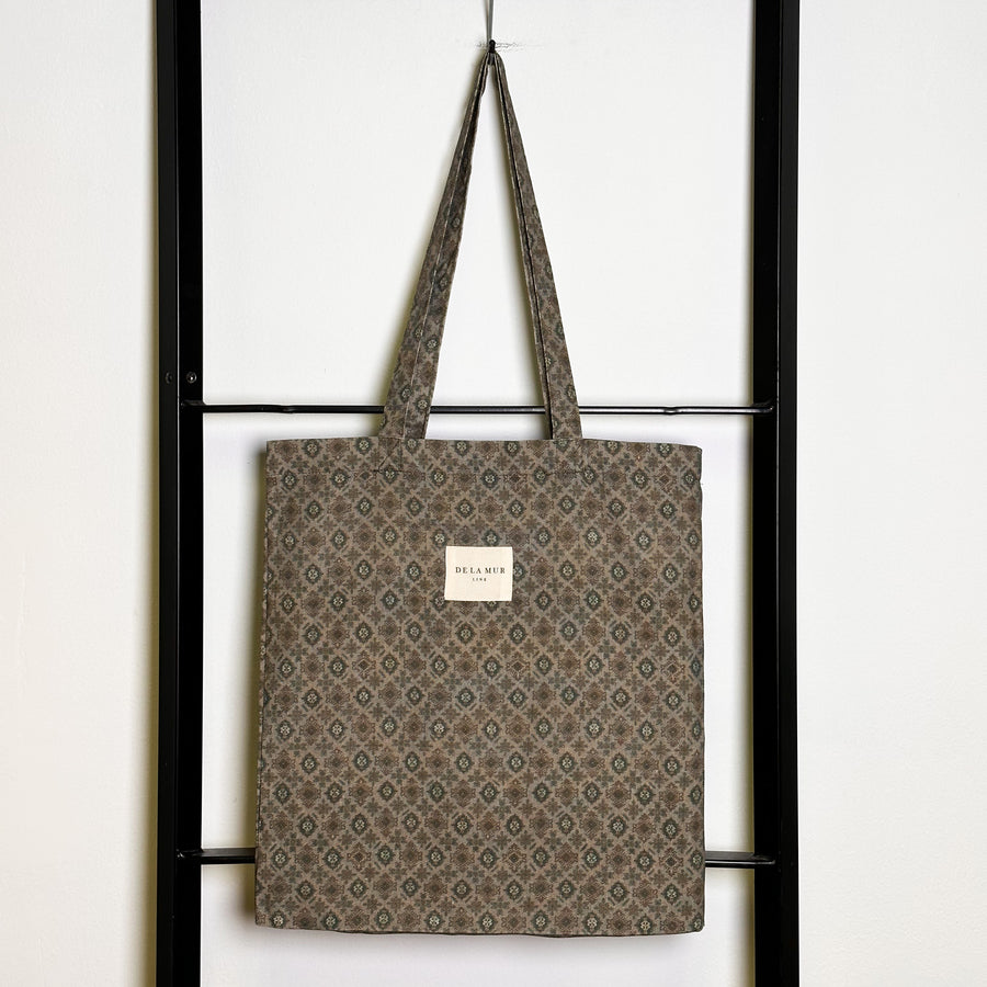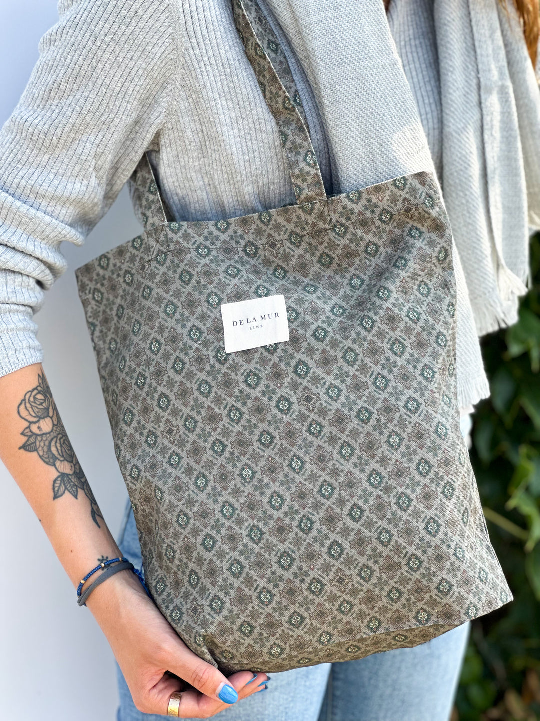 Bolsa “tote bag” con asas para llevar al hombro. Con tejido fino con estampado geométrico de color verde caqui. Para su correcto mantenimiento se aconseja lavarlo en frío a mano y no utilizar secadora.