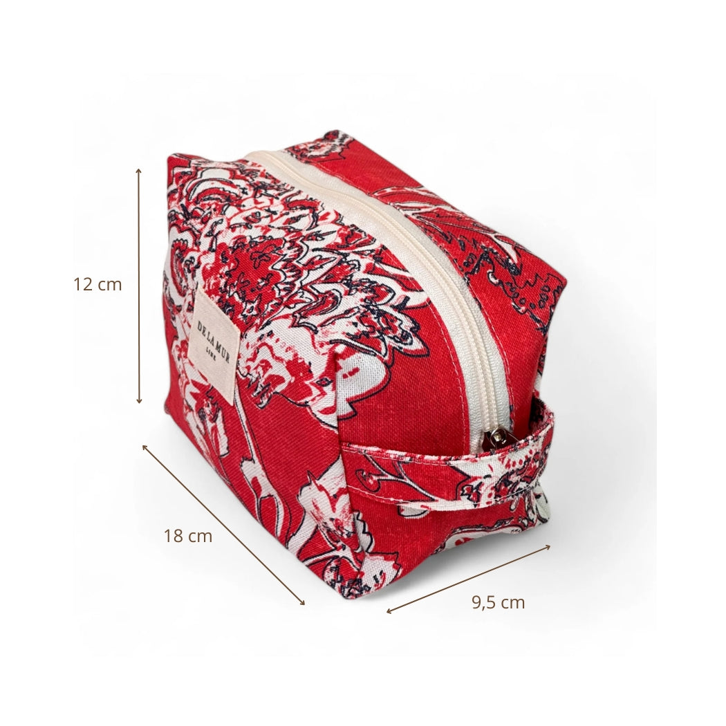 Neceser mediano con cremallera en la parte superior y con asa lateral. Con tejido fino de half-panama con estampado floral en tono blanco y rojo. Para su correcto mantenimiento se aconseja lavarlo en frío y no utilizar secadora.