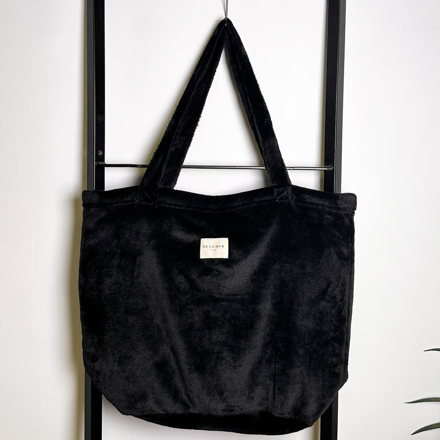 Bolsa shopper grande con asas para llevar al hombro. Con tejido grueso de pelo suave negro. Para su correcto mantenimiento se aconseja lavarlo en frío a mano y no utilizar secadora.