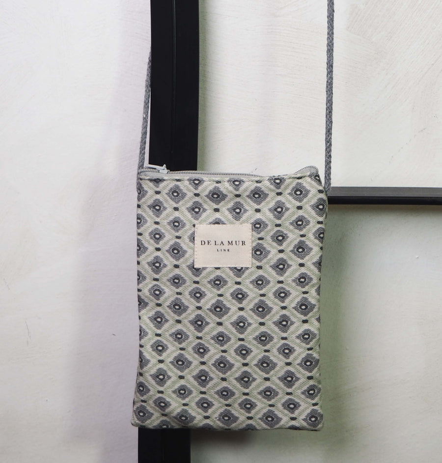 Bolsito porta móvil con cremallera en la parte superior y cordón largo para llevar tipo bandolera. Con tejido con estampado geométrico con tonos grisáceos y verdes. Cordón de algodón de color gris. Para su correcto mantenimiento se aconseja lavarlo en frío y no utilizar secadora.