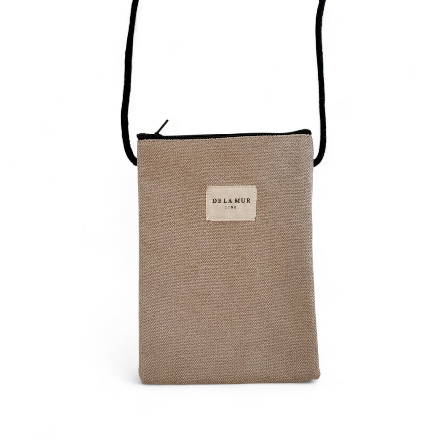 Bolsito porta móvil para llevar tipo bandolera, con cremallera en la parte superior y cordón largo de algodón de color negro. Con tejido grueso liso de color beige. Forrado de tejido grueso de color gris en la parte interior. Para su correcto mantenimiento se aconseja lavarlo en frío a mano y no utilizar secadora.