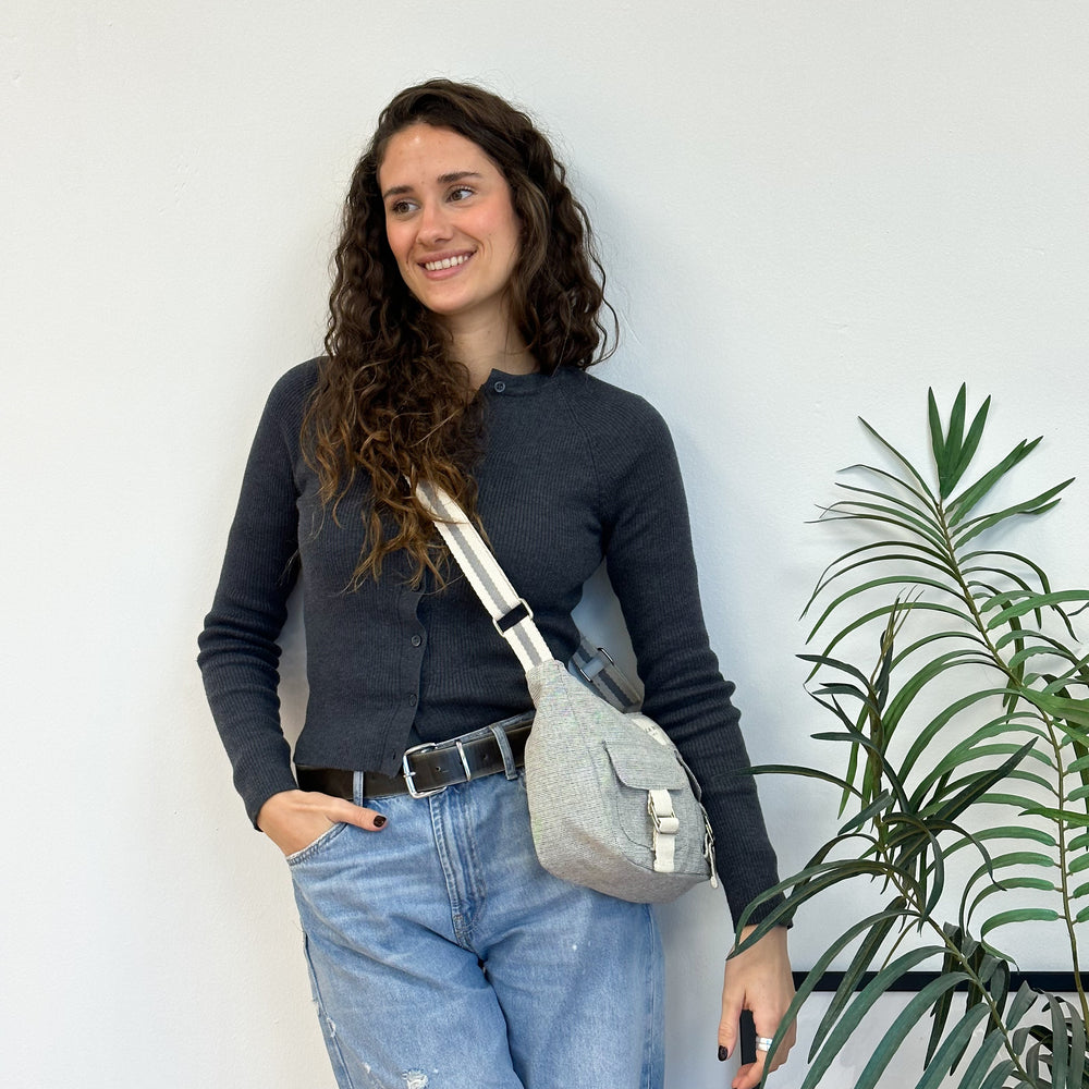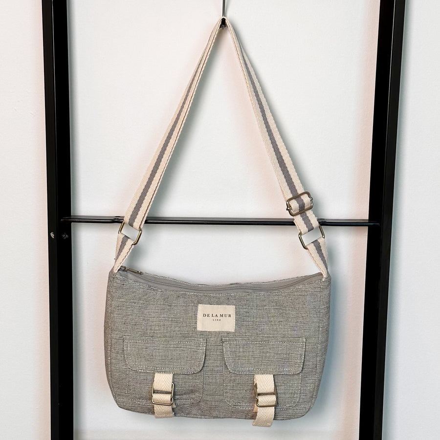 Bolso bolsillos solapa tipo bandolera con asa larga ajustable de cinta de espiga de algodón de color crudo con raya gris en el centro. Con un tejido fino liso gris claro. Cierre superior con cremallera. Dos bolsillos delanteros con solapa cerrados con cinta y hebilla. Forrado de tejido grueso de color gris en la parte interior. Bolsillo interior con cremallera. Para su correcto mantenimiento se aconseja lavarlo en frío a mano y no utilizar secadora.