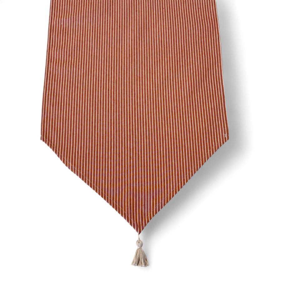 Camino de mesa acabado en forma de pico con borla en los extremos de color beige. Con tejido fino con textura con estampado a rayas de color crudo sobre fondo color caldera. Para su correcto mantenimiento se aconseja lavarlo en frío y no utilizar secadora.