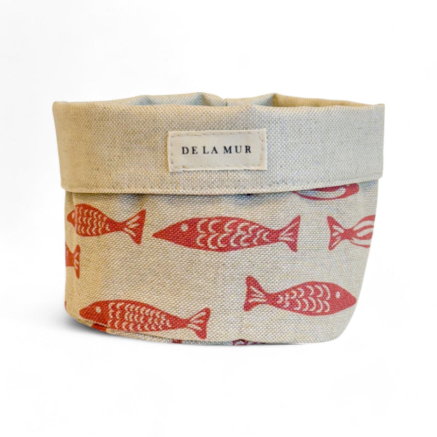 Cesta pequeña multiusos. Con tejido fino de half-panama con estampado de peces de color teja en el exterior y tejido resinado en el interior. Para su correcto mantenimiento se aconseja lavarlo en frío y no utilizar secadora.