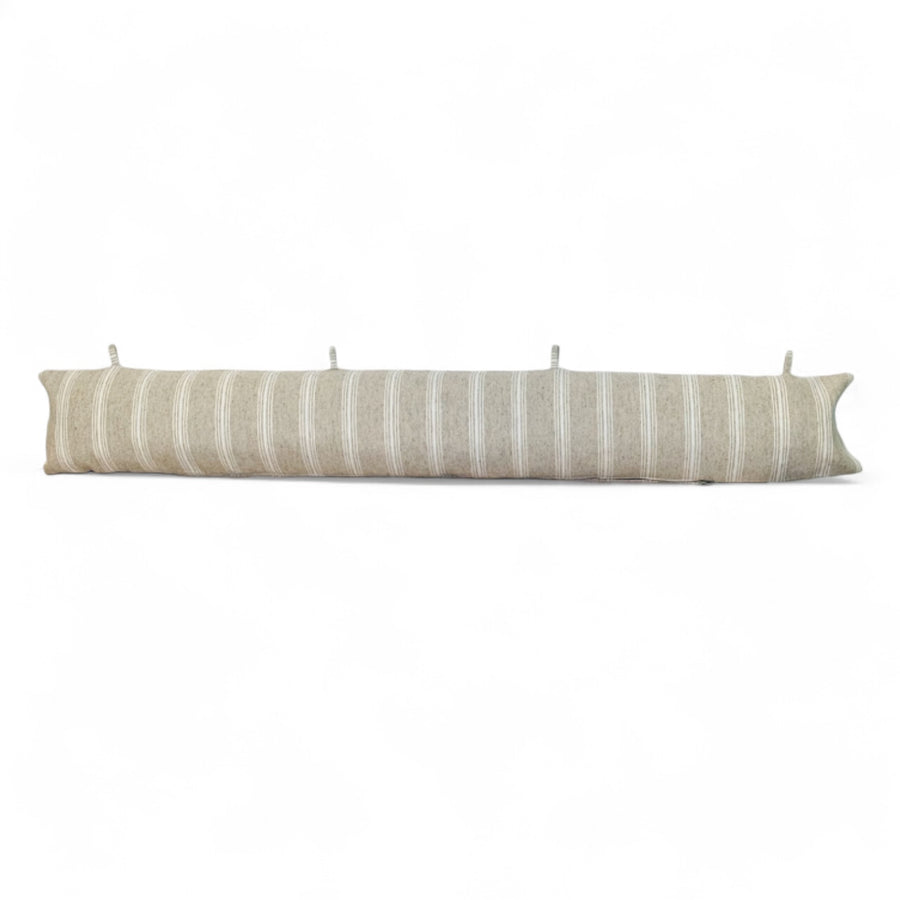 Cortavientos con relleno. Con pequeñas asas para colgar en la puerta. Con tejido fino con textura con estampado a rayas de color crudo sobre fondo beige. Para su correcto mantenimiento se aconseja lavarlo en agua fría y no utilizar secadora.