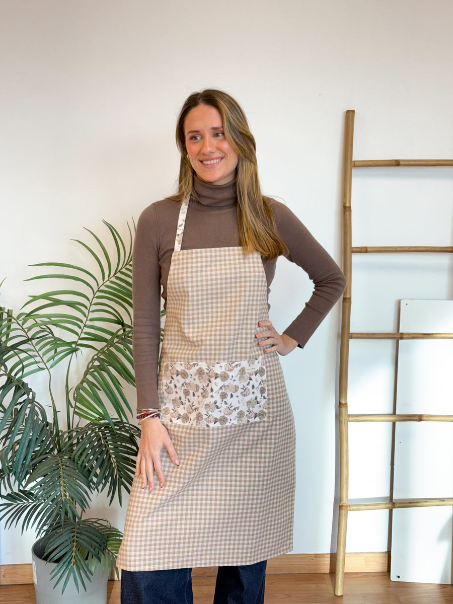 Delantal con bolsillo delantero. Con tejido fino de half-panama con estampado a cuadros vichy de color beige combinado con un tejido fino de half-panama con estampado floral en el bolsillo. Para su correcto mantenimiento se aconseja lavarlo en frío y no utilizar secadora.