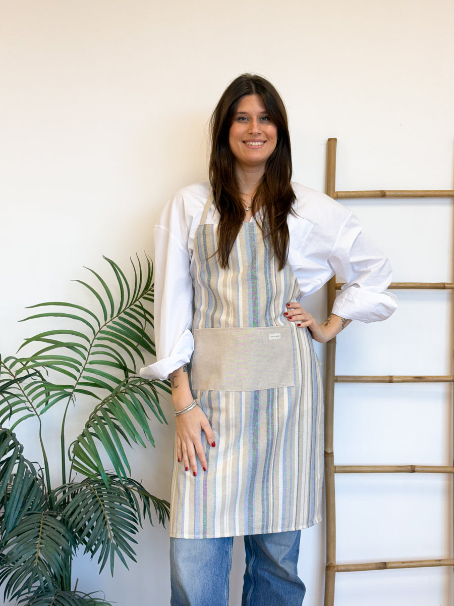Delantal con bolsillo delantero. Con tejido fino con estampado a rayas en tonos beige y azul combinado con tejido liso beige en el bolsillo. Para su correcto mantenimiento se aconseja lavarlo en frío y no utilizar secadora.