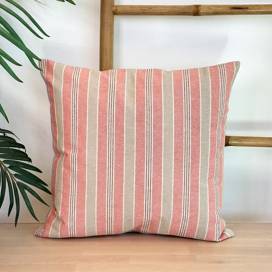 Funda de cojín sin relleno. Combinado con dos tejidos diferentes, un tejido con estampado a rayas rojas y beige por una cara, y un tejido liso de color beige por la otra. Para su correcto mantenimiento se aconseja lavarlo en frío y no utilizar secadora.