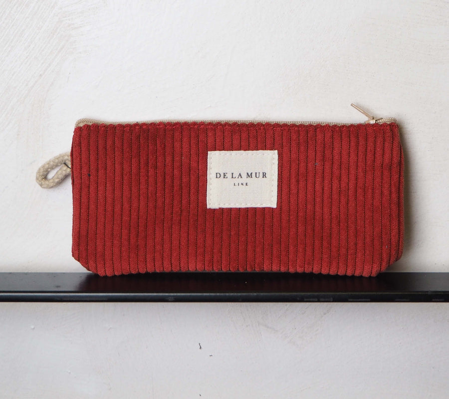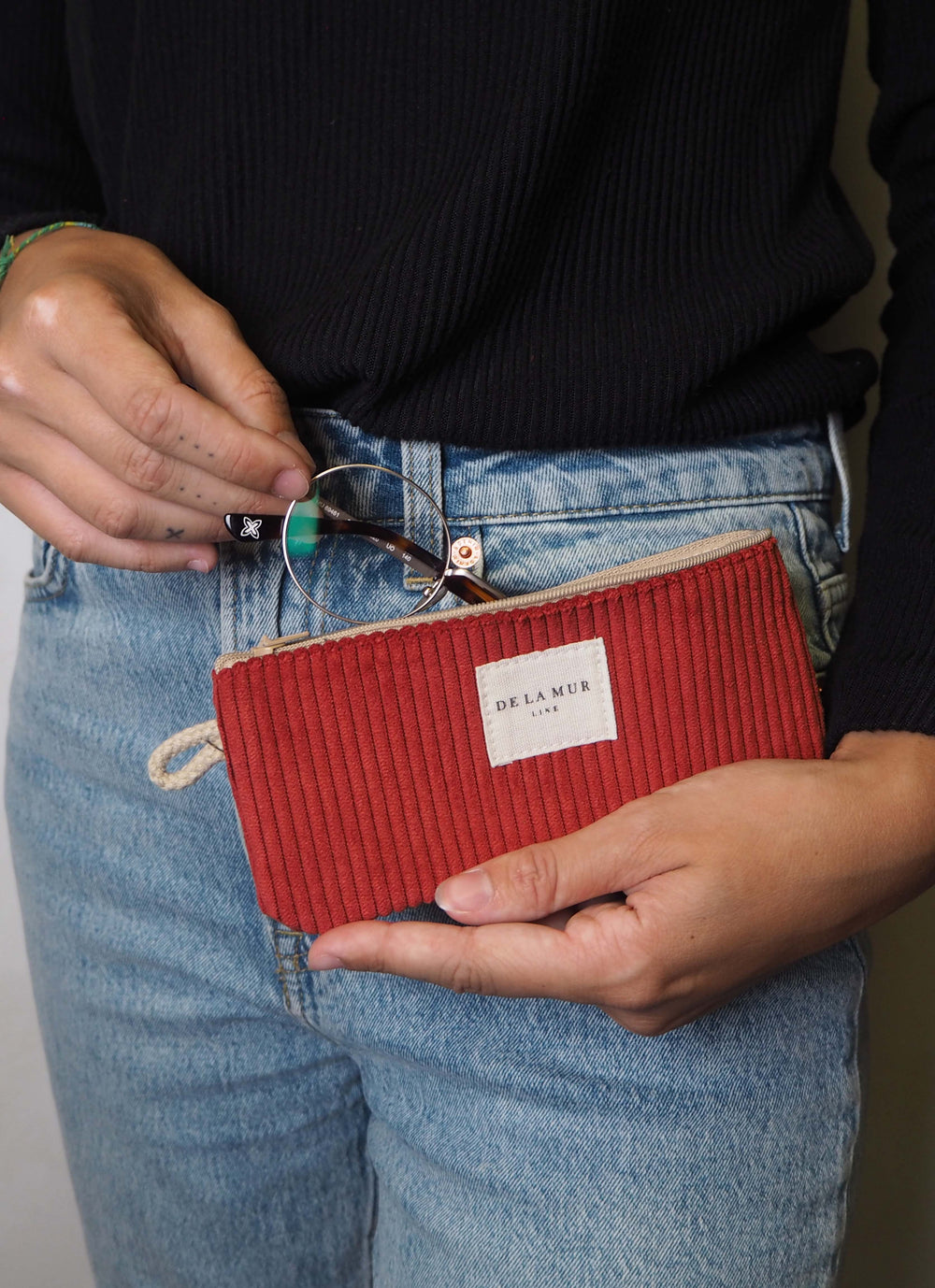 Funda de gafas con cremallera en la parte superior y pequeña asa de cordón de color beige en el lateral. Con tejido de pana de color rojo. Para su correcto mantenimiento se aconseja lavarlo en frío y no utilizar secadora.