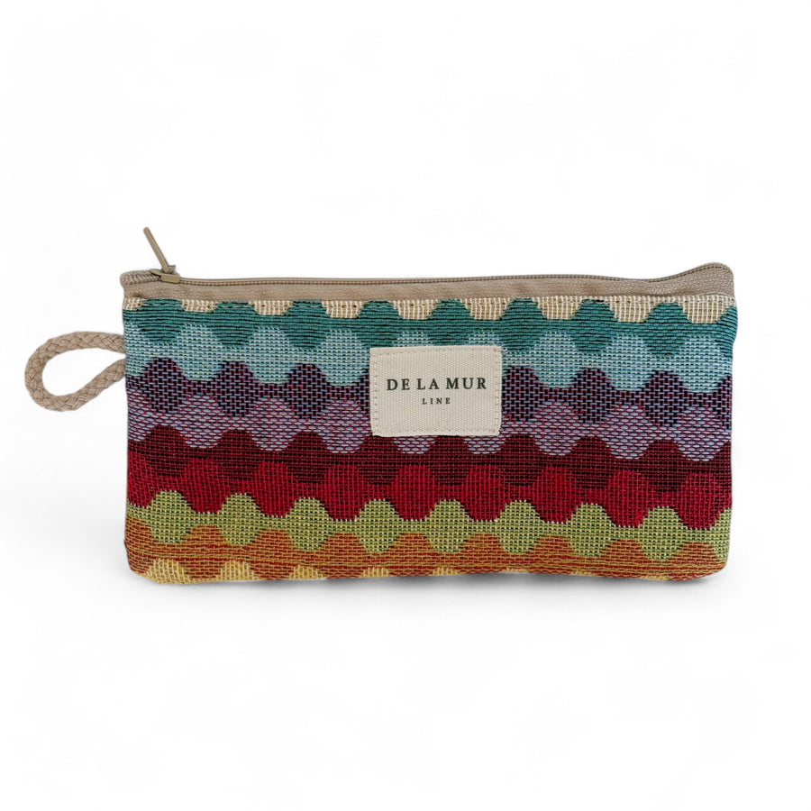 Funda de gafas con cremallera en la parte superior y pequeña asa de cordón de color beige en el lateral. Con tejido grueso de jacquard con estampado geométrico multicolor. Cada articulo puede tener una variación en el estampado, dependiendo de donde se haya efectuado el corte de la pieza. Forrado de tejido grueso de color gris en la parte interior. Para su correcto mantenimiento se aconseja lavarlo en frío a mano y no utilizar secadora.
