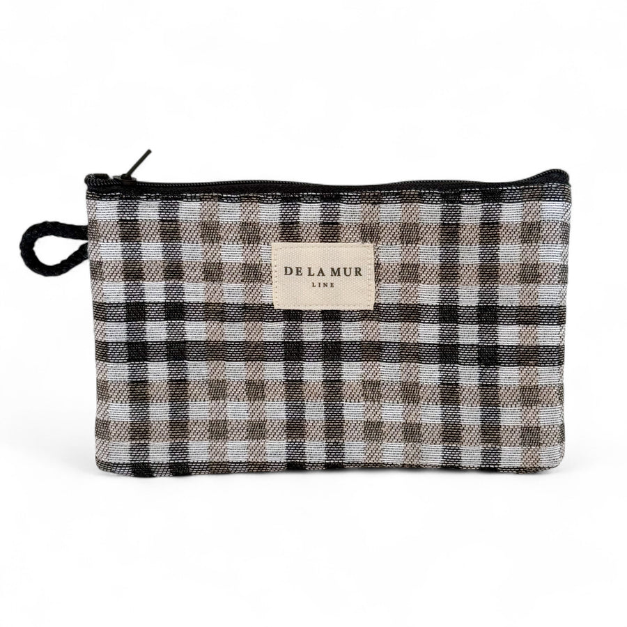 Mini neceser con cremallera en la parte superior y pequeña asa de cordón de color negro en el lateral. Con tejido grueso de jacquard con estampado a cuadros de color beige y negro. Cada articulo puede tener una variación en el estampado, dependiendo de donde se haya efectuado el corte de la pieza. Forrado de tejido grueso de color gris en la parte interior. Para su correcto mantenimiento se aconseja lavarlo en frío a mano y no utilizar secadora.