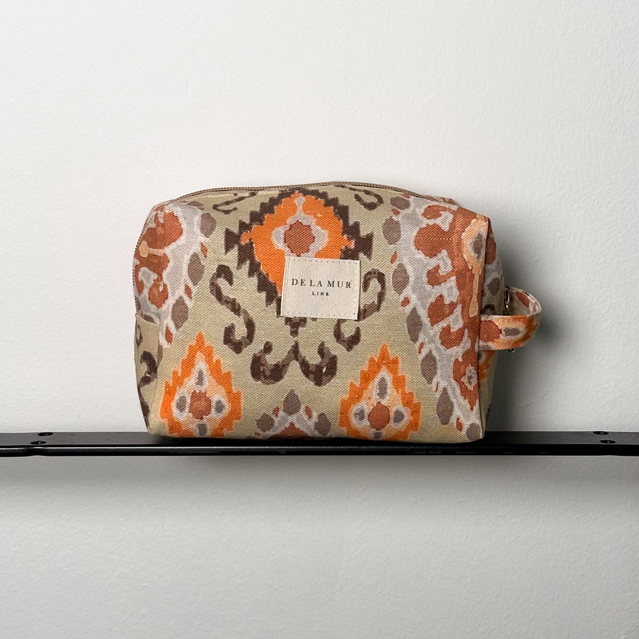 Neceser mediano con cremallera en la parte superior y con asa lateral. Con un tejido estampado geométrico en tonos anaranjados. Para su correcto mantenimiento se aconseja lavarlo en frío y no utilizar secadora.