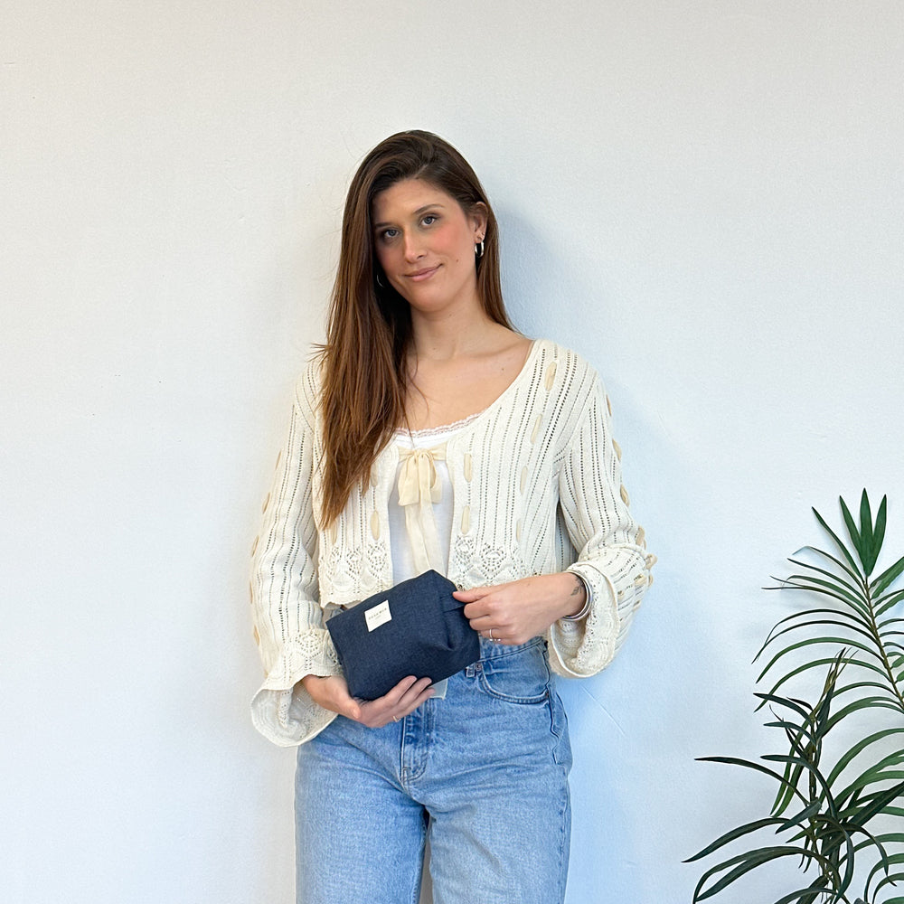 Neceser mediano con cremallera en la parte superior y con asa lateral. Con un tejido fino liso de color azul marino. Para su correcto mantenimiento se aconseja lavarlo en frío y no utilizar secadora.