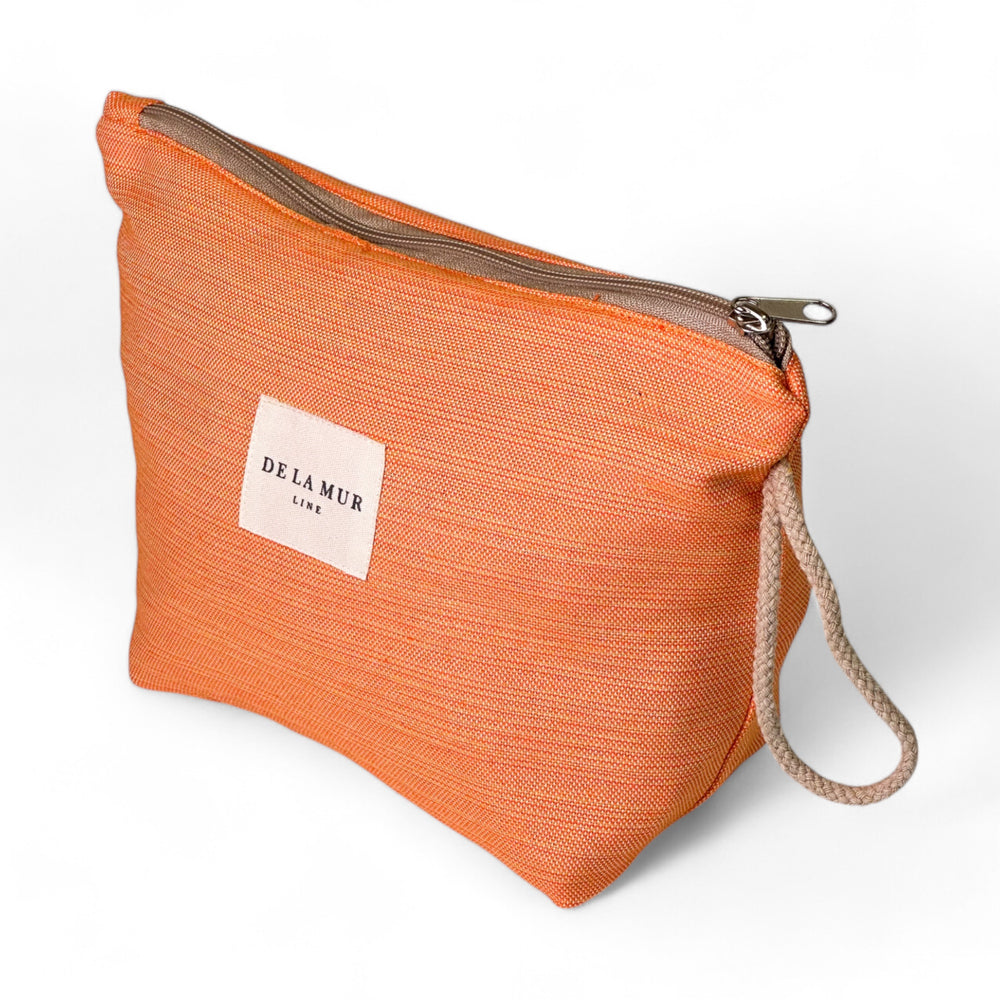 Neceser con cremallera en la parte superior y asa de cordón de color beige en el lateral. Con tejido fino de half-panama liso naranja. Forrado de tejido grueso de color gris en la parte interior. Para su correcto mantenimiento se aconseja lavarlo en frío a mano y no utilizar secadora.