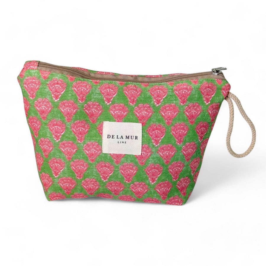 Neceser con cremallera en la parte superior y asa de cordón de color beige en el lateral. Con tejido fino de half-panama con estampado floral rosa sobre fondo verde. Forrado de tejido grueso de color gris en la parte interior. Para su correcto mantenimiento se aconseja lavarlo en frío a mano y no utilizar secadora.