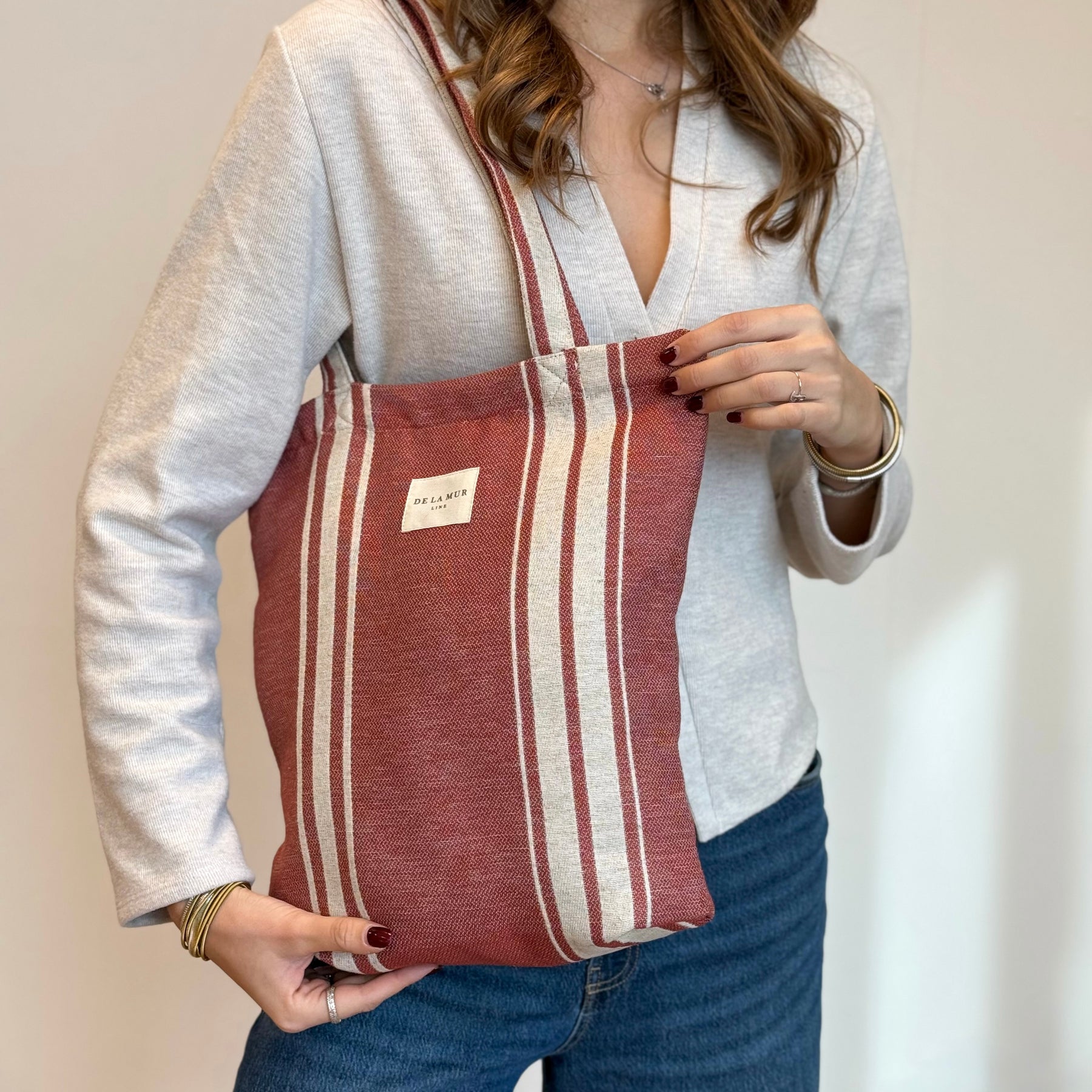 Bolsa "tote bag" con asas para llevar al hombro. Con tejido grueso de jacquard 80% algodón y 20% poliéster con estampado a rayas crudas sobre fondo teja. Con cremallera en la parte superior. Para su correcto mantenimiento se aconseja lavarlo en frío y no utilizar secadora.