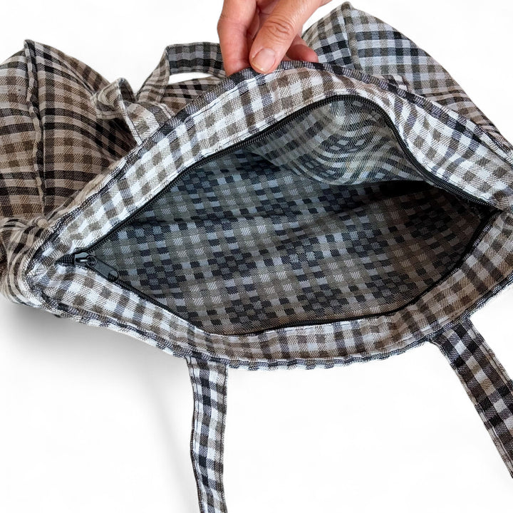 Bolsa mediana con cremallera en la parte superior y asas para llevar al hombro. Con bolsillos laterales. Con tejido grueso de jacquard con estampado a cuadros beige y negro. Para su correcto mantenimiento se aconseja lavarlo en frío a mano y no utilizar la secadora.