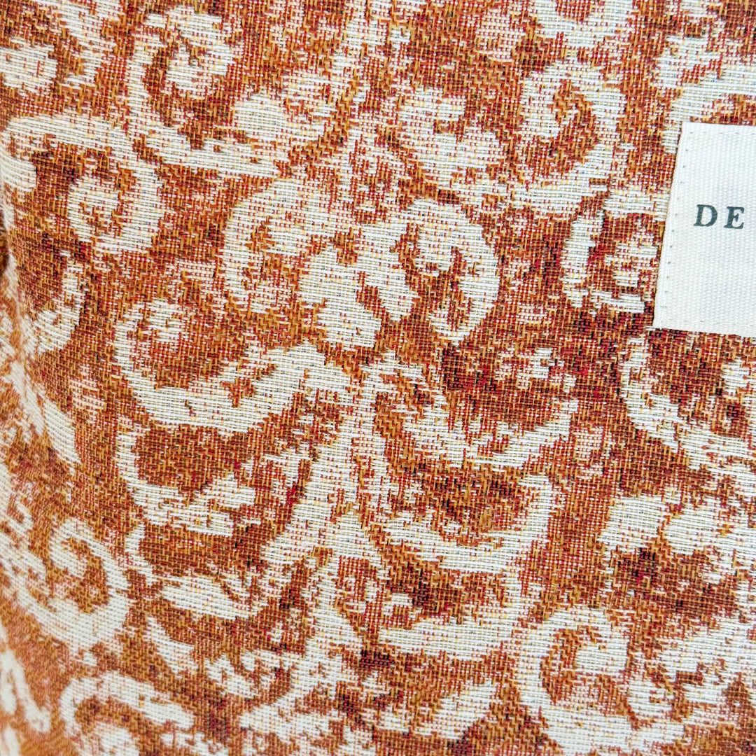 Bolsa mediana con cremallera en la parte superior y asas para llevar al hombro. Con bolsillos laterales. Con tejido grueso de jacquard con estampado geométrico de color teja. Para su correcto mantenimiento se aconseja lavarlo en frío a mano y no utilizar la secadora.