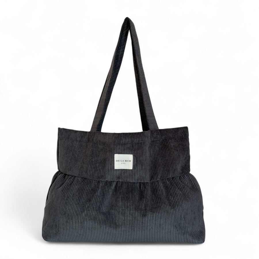 Bolsa mediana volantes. Con tejido grueso de pana gris oscuro. Para su correcto mantenimiento se aconseja lavarlo en frío a mano y no utilizar la secadora.