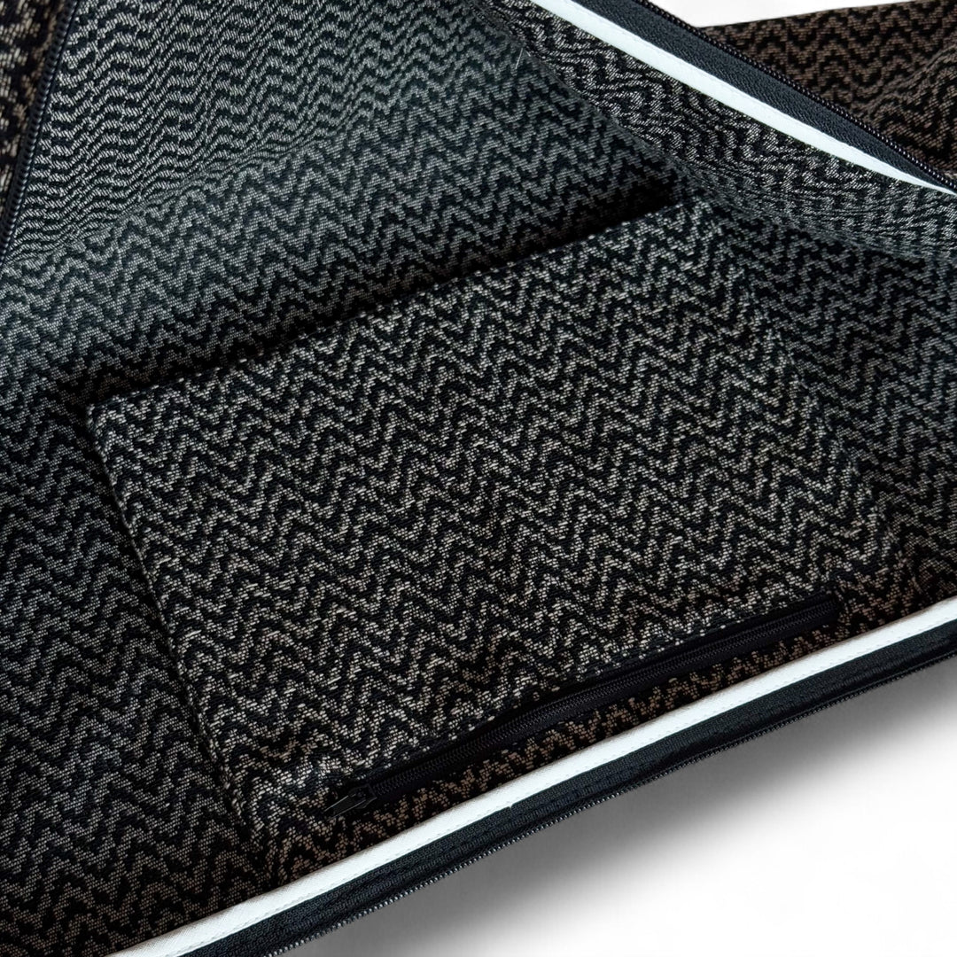 Bolsa para guardar esterilla con asa regulable para llevar al hombro o cruzada. Con cremallera en la parte superior. Con tejido grueso de jacquard con estampado de espiga de color beige y negro. Con bolsillo con cremallera interior. Para su correcto mantenimiento se aconseja lavarlo en frío a mano y no utilizar la secadora.