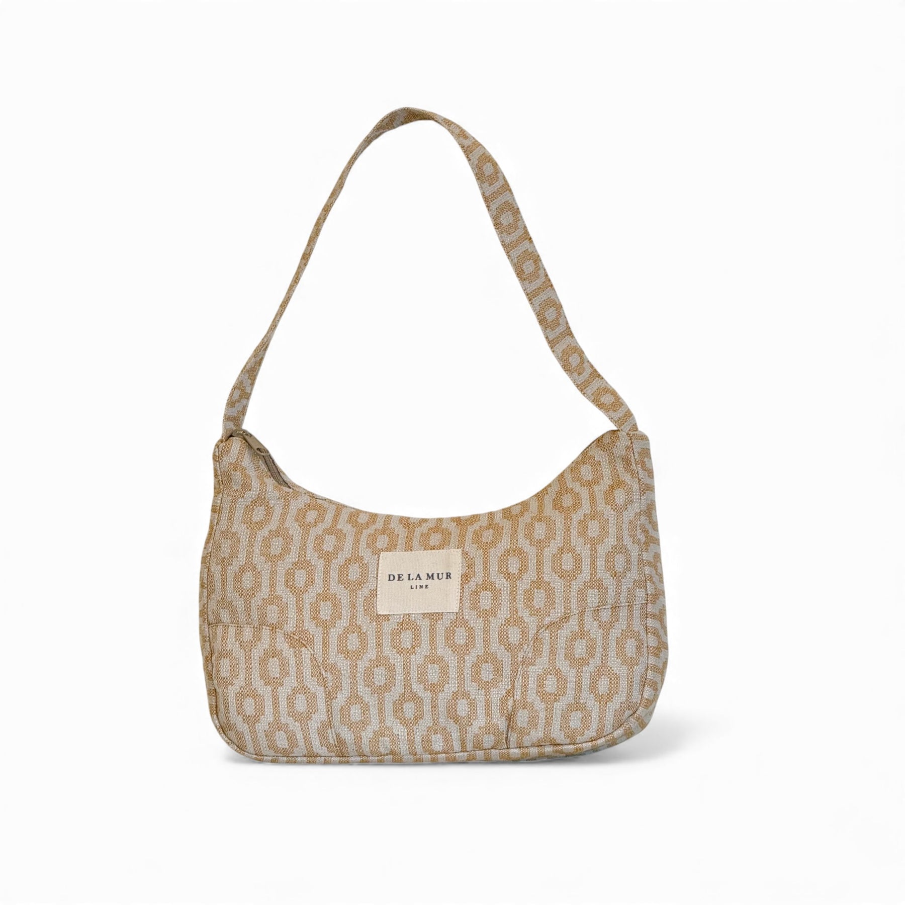 Bolso pequeño para llevar al hombro con asa de tejido. Cierre superior con cremallera. Con tejido grueso de jacquard 80% algodón y 20% poliéster con estampado geométirco mostaza. Forrado de tejido grueso de color gris en la parte interior. Bolsillo interior con cremallera. Para su correcto mantenimiento se aconseja lavarlo en frío a mano y no utilizar secadora.