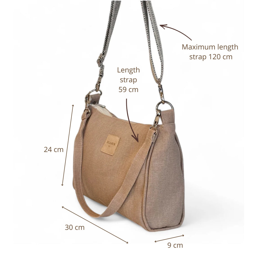 Bolso mediano con asa larga ajustable y un asa corta de tejido. Con un tejido liso de color beige. Opción de llevarlo al hombro o como bandolera. Bolsillo interior con cremallera. Asa de cinta de espiga de algodón de color crudo con zigzag de color gris oscuro en el centro. Etiqueta de marca de polipiel. Para su correcto mantenimiento se aconseja lavarlo en frío a mano y no utilizar secadora.