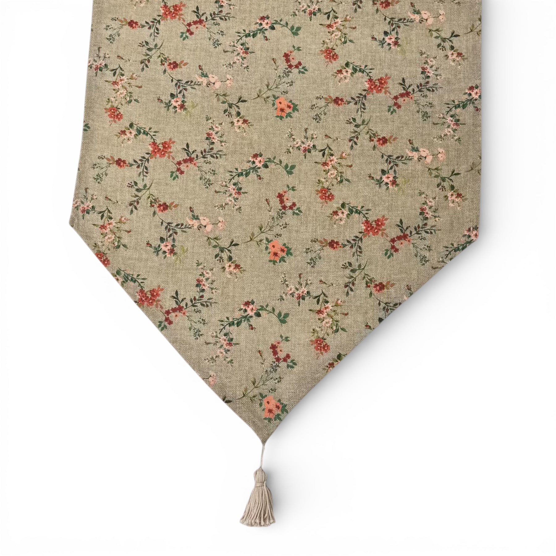 Camino de mesa acabado en forma de pico con borlas beige en los extremos, confeccionado en tejido fino de half-panama 80% algodón y 20% poliéster, con estampado floral anaranjado. Una pieza con textura y carácter que realza la mesa y aporta un toque decorativo muy especial.
