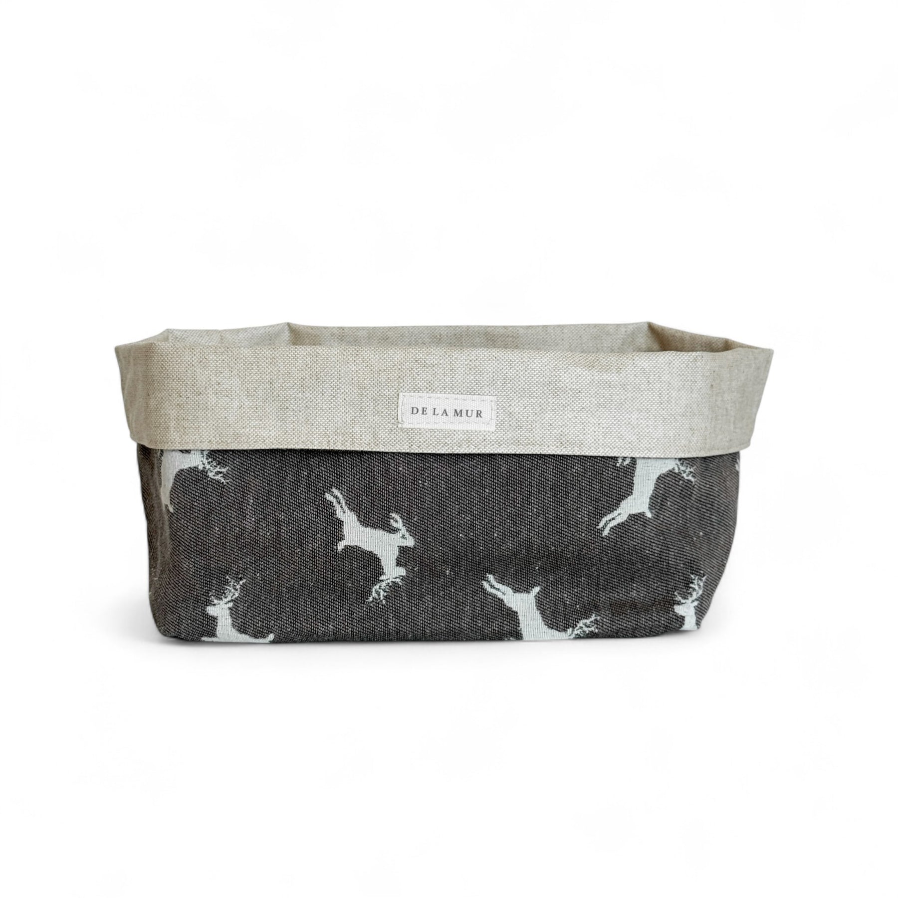 Cesta grande multiusos. Con tejido de jacquard con estampado de renos de color topo y blanco en el exterior y tejido resinado en el interior. Para su correcto mantenimiento se aconseja lavarlo en frío y no utilizar secadora.