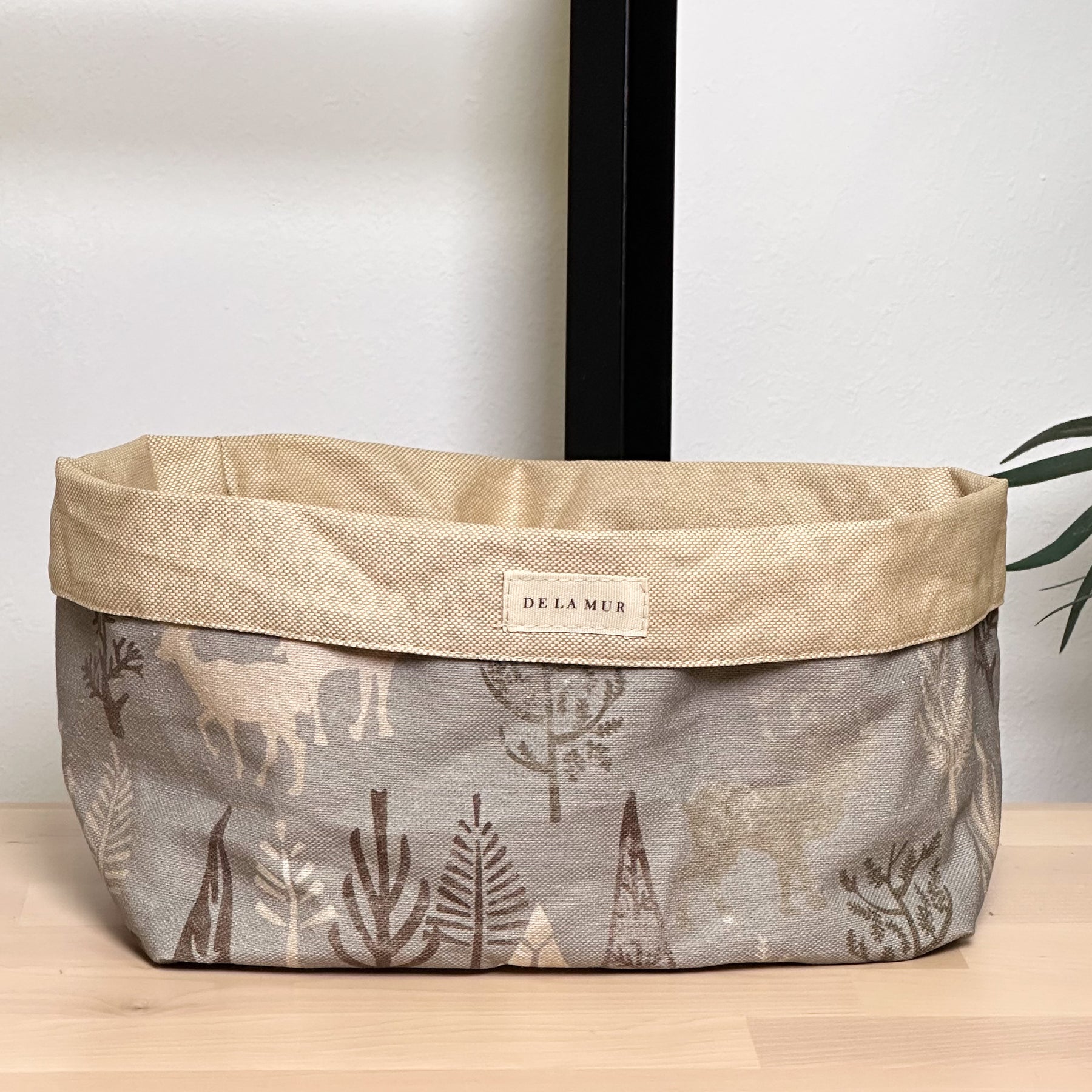 Cesta grande rim multiusos. Con tejido con estampado invernal en tonos marrón y crudo sobre fondo gris en el exterior y tejido resinado en el interior. Para su correcto mantenimiento se aconseja lavarlo en frío y no utilizar secadora.