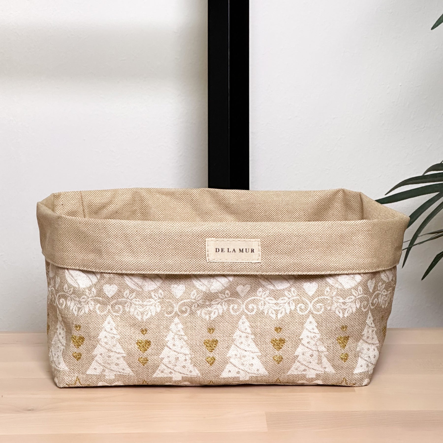Cesta grande multiusos. Con tejido con estampado navideño dorado y beige en el exterior y tejido resinado en el interior. Para su correcto mantenimiento se aconseja lavarlo en frío y no utilizar secadora.