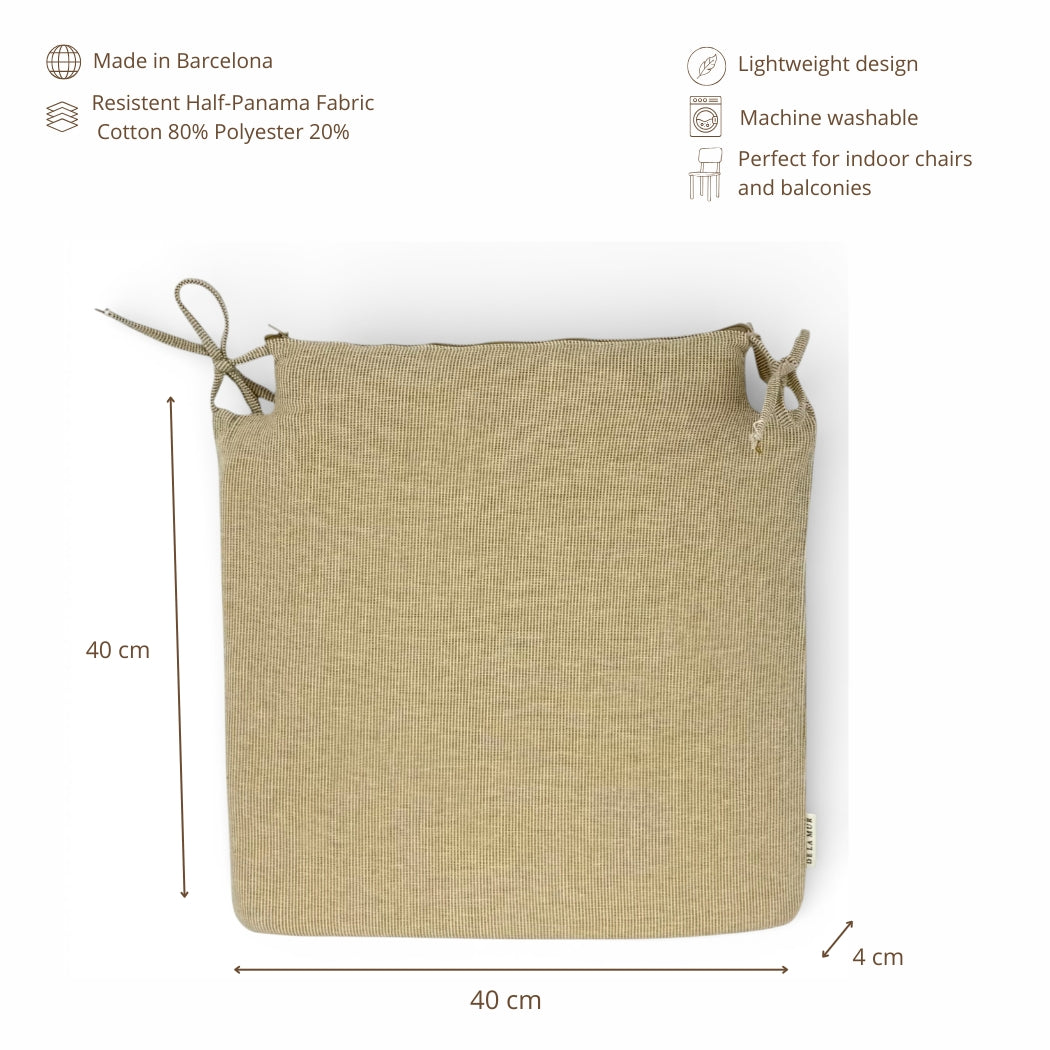 Cojín cuadrado para silla con encajes, relleno incluido y cintas para atarlo fácilmente. Está confeccionado en tejido fino con relieve 80% algodón y 20% poliéster, de gran calidad, con estampado de mini rayas mostaza, que aportan luz y calidez.