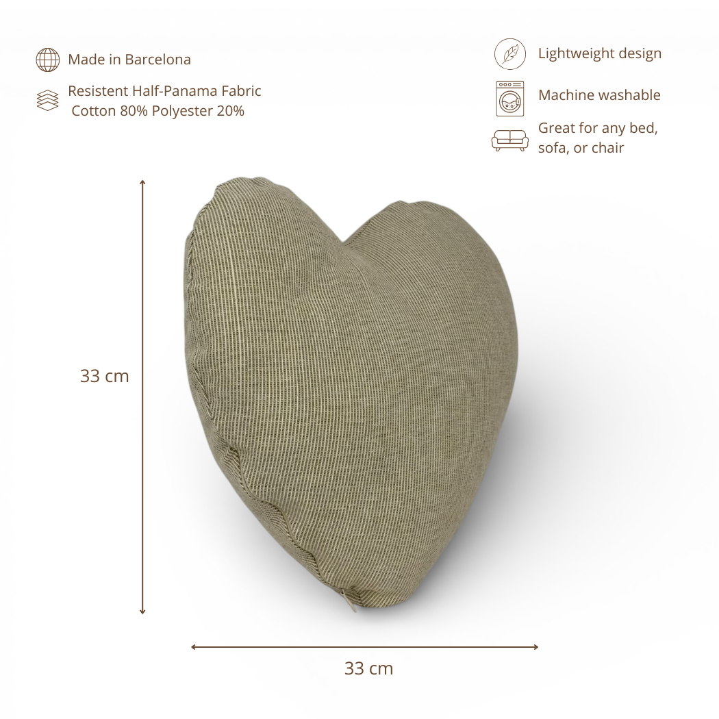 Cojín en forma de corazón con relleno, confeccionado en tejido con relieve 80% algodón y 20% poliéster de gran calidad con estampado a mini rayas mostaza. Su diseño especial y su textura aportan un toque delicado y original a la decoración del hogar.