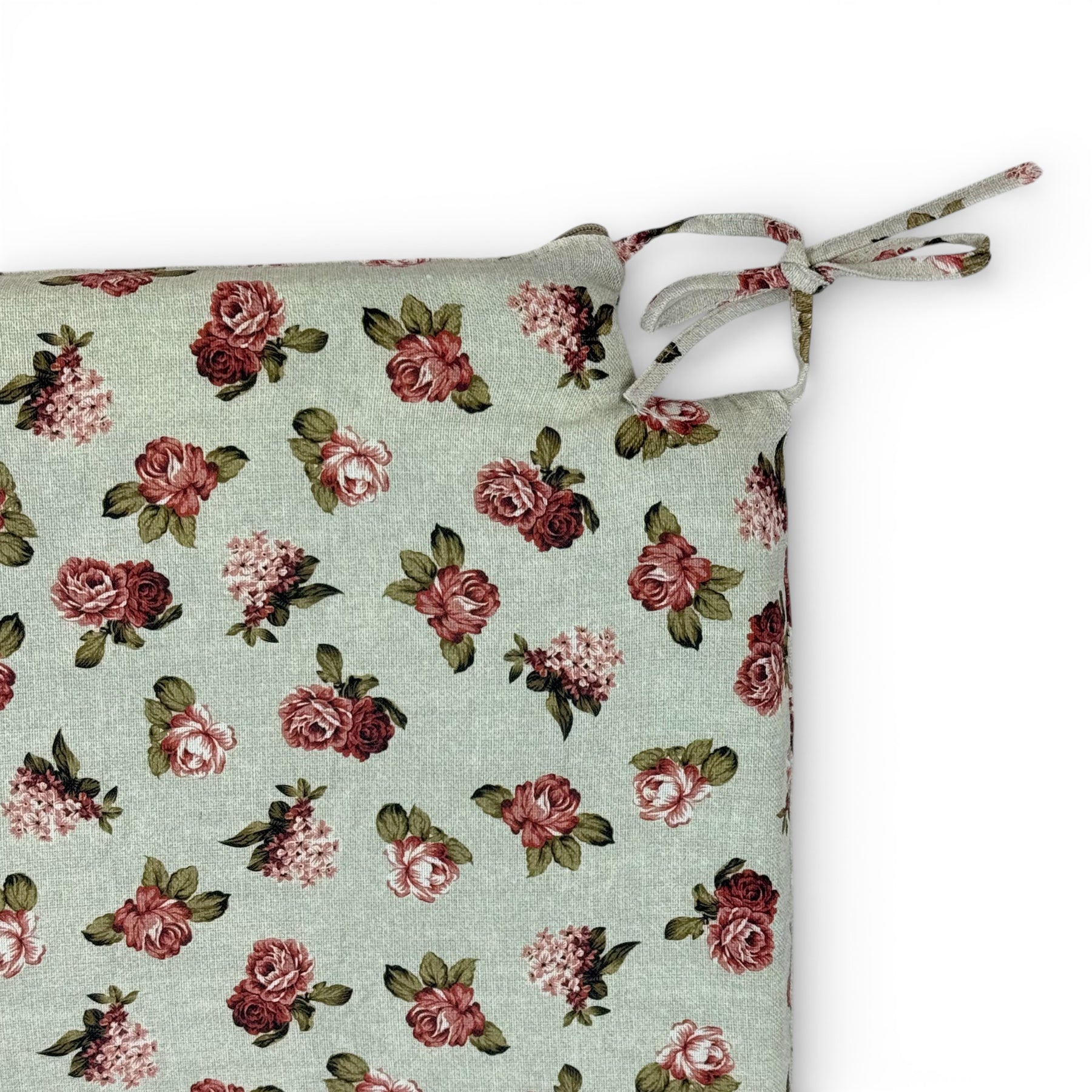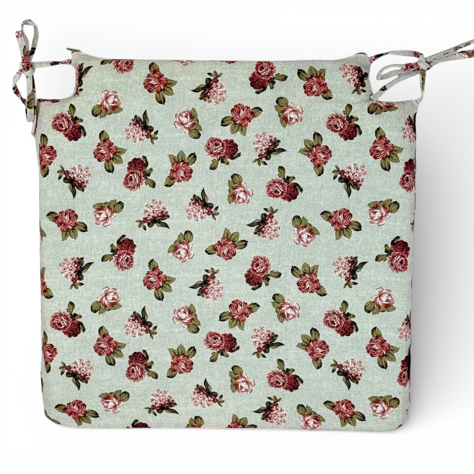 Cojín cuadrado para silla con encajes, relleno incluido y cintas para atarlo fácilmente. Está confeccionado en tejido fino de half-panama 80% algodón y 20% poliéster, de gran calidad, con estampado floral rosado, que aportan luz y calidez.