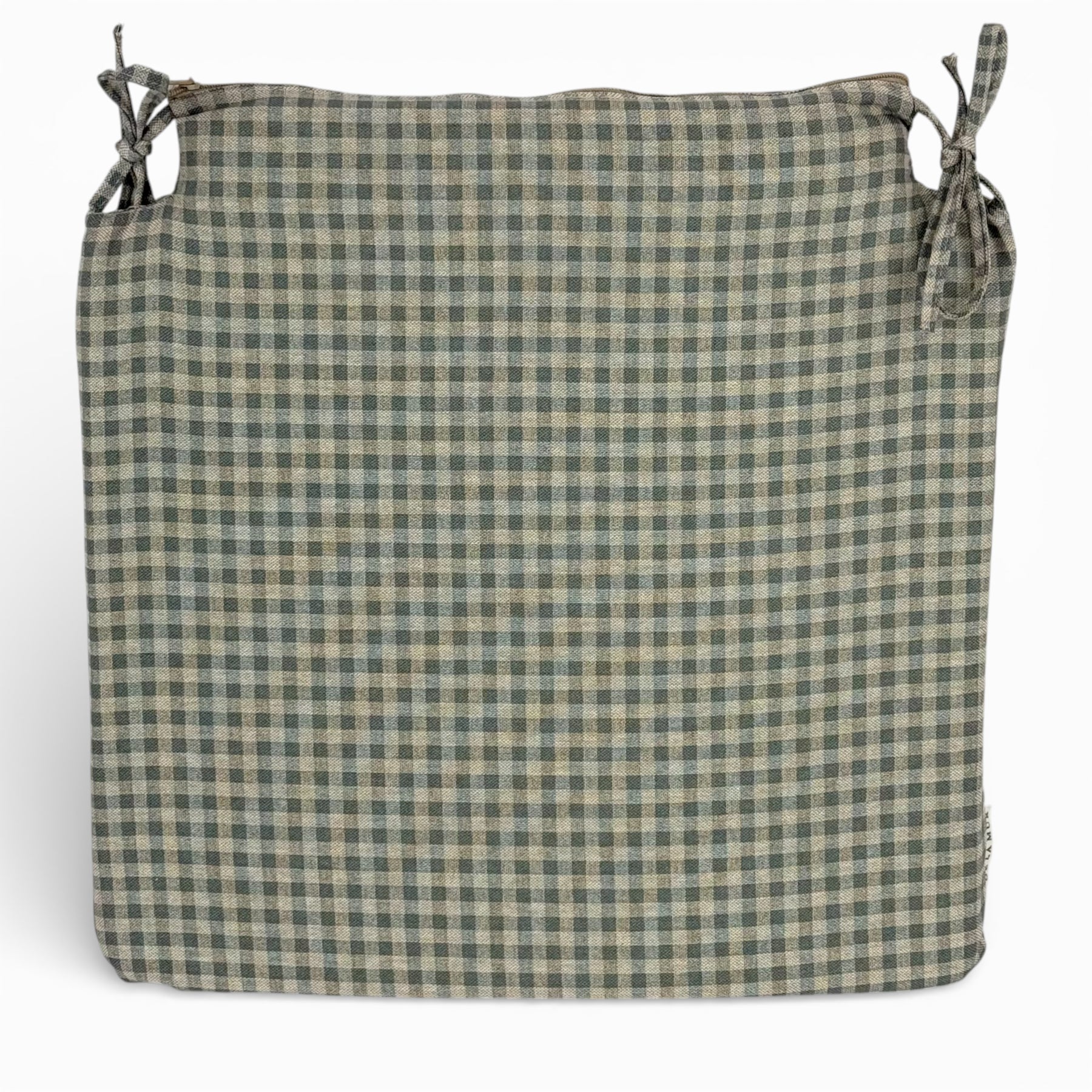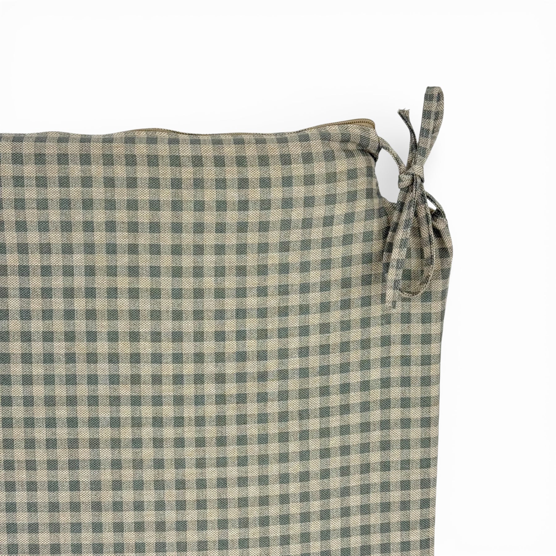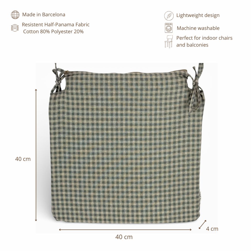 Cojín cuadrado para silla con encajes, relleno incluido y cintas para atarlo fácilmente. Está confeccionado en tejido fino de half-panama 80% algodón y 20% poliéster, de gran calidad, con estampado fa cuadros vichy azules y gris, que aportan luz y calidez.