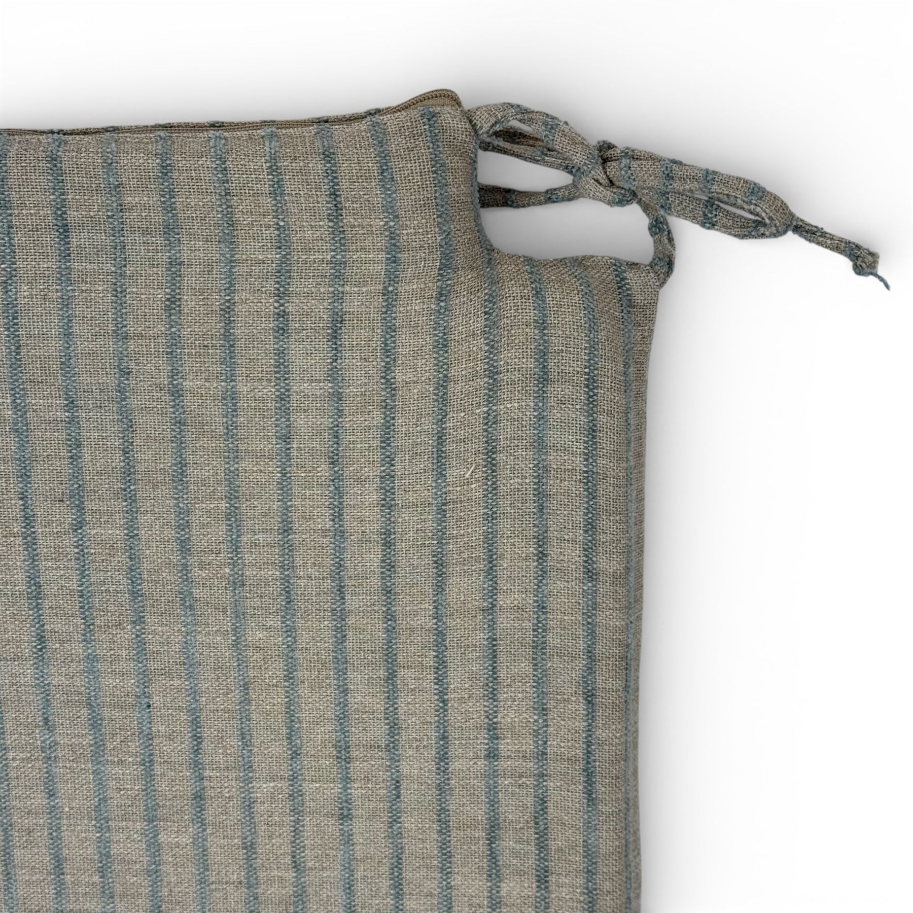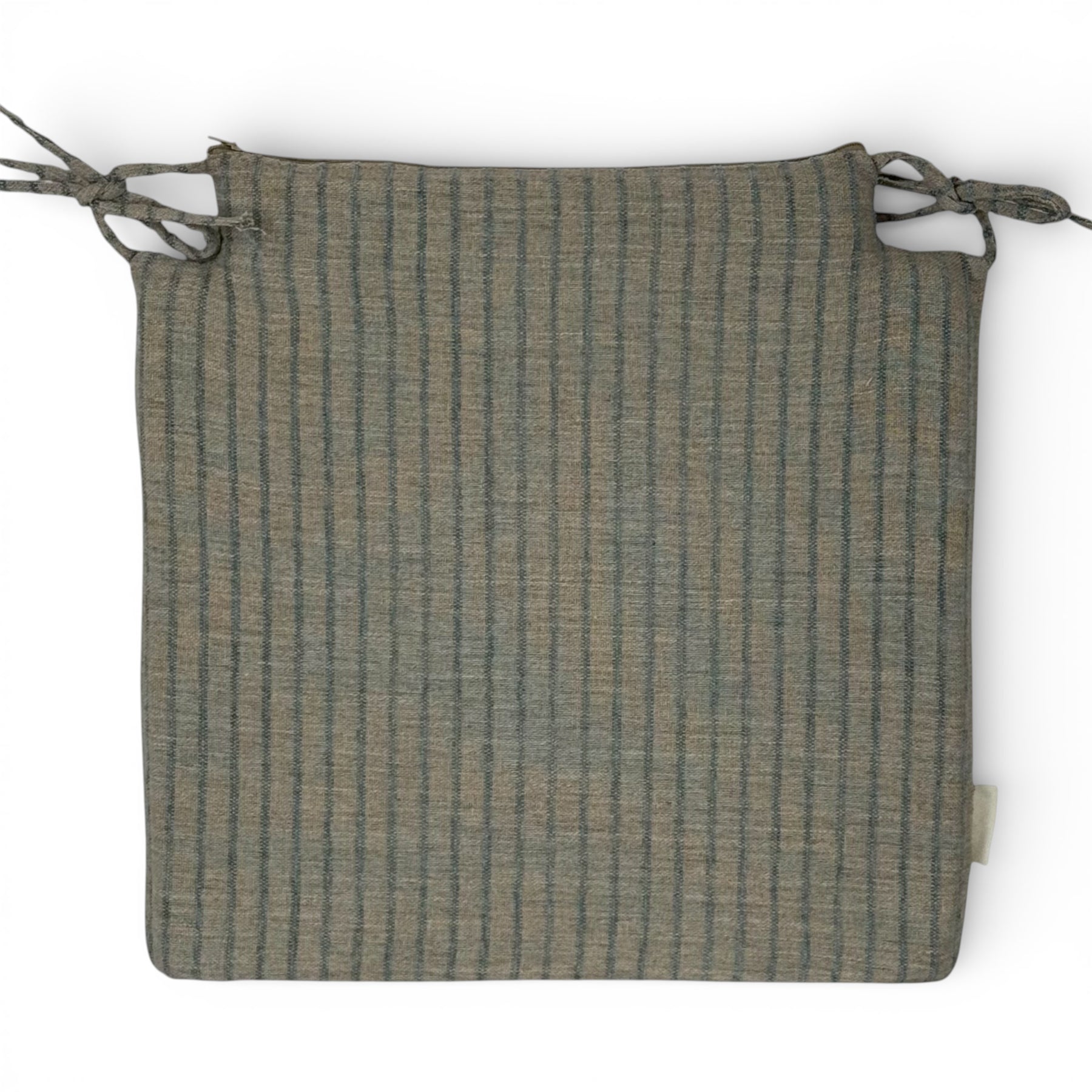 Cojín cuadrado para silla con encajes, relleno incluido y cintas para atarlo fácilmente. Está confeccionado en tejido fino de half-panama 80% algodón y 20% poliéster, de gran calidad, con estampado a rayas azules, que aportan luz y calidez.