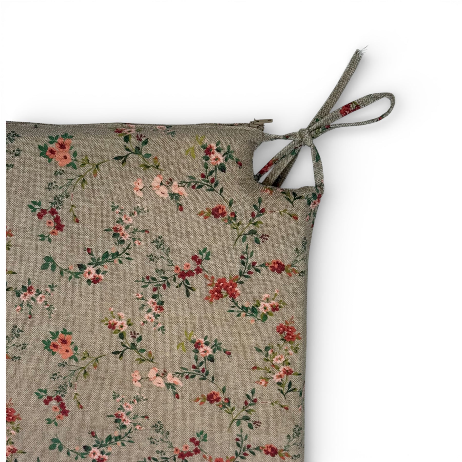 Cojín cuadrado para silla con encajes, relleno incluido y cintas para atarlo fácilmente. Está confeccionado en tejido fino de half-panama 80% algodón y 20% poliéster, de gran calidad, con estampado floral naranja, que aportan luz y calidez.