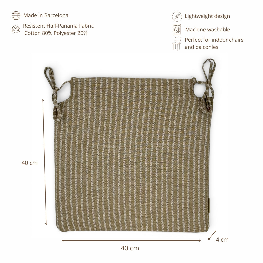 Cojín cuadrado para silla con encajes, relleno incluido y cintas para atarlo fácilmente. Está confeccionado en tejido fino con relieve 80% algodón y 20% poliéster, de gran calidad, con estampado a rayas beige, que aportan luz y calidez.