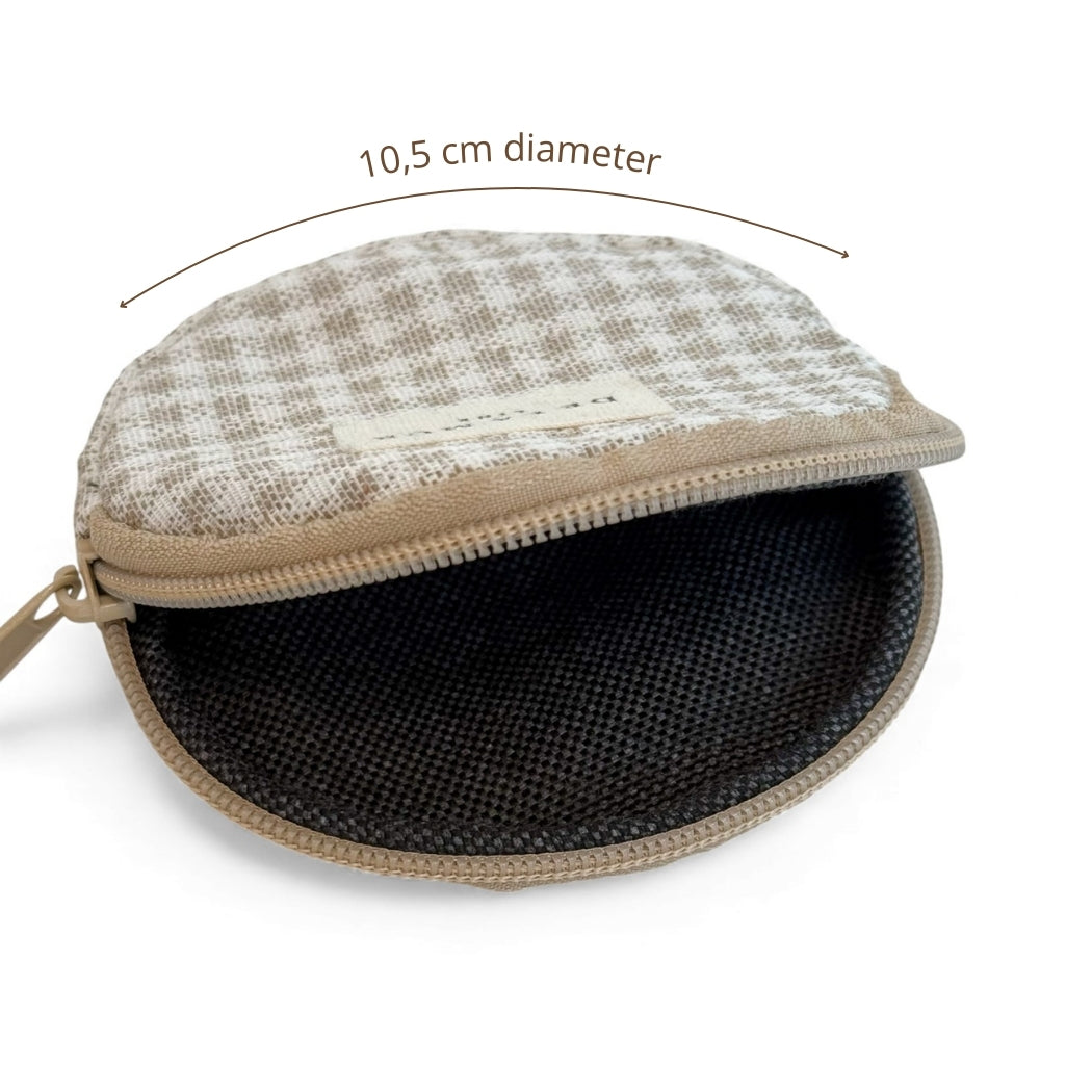 Monedero redondo con cremallera en la parte superior. Con tejido grueso de jacquard 80% algodón y 20% poliéster con estampado a cuadros vichy en tonos beige y crudo. Cada articulo puede tener una variación en el estampado, dependiendo de donde se haya efectuado el corte de la pieza. Forrado de tejido grueso de color gris en la parte interior. Para su correcto mantenimiento se aconseja lavarlo en frío y no utilizar secadora.