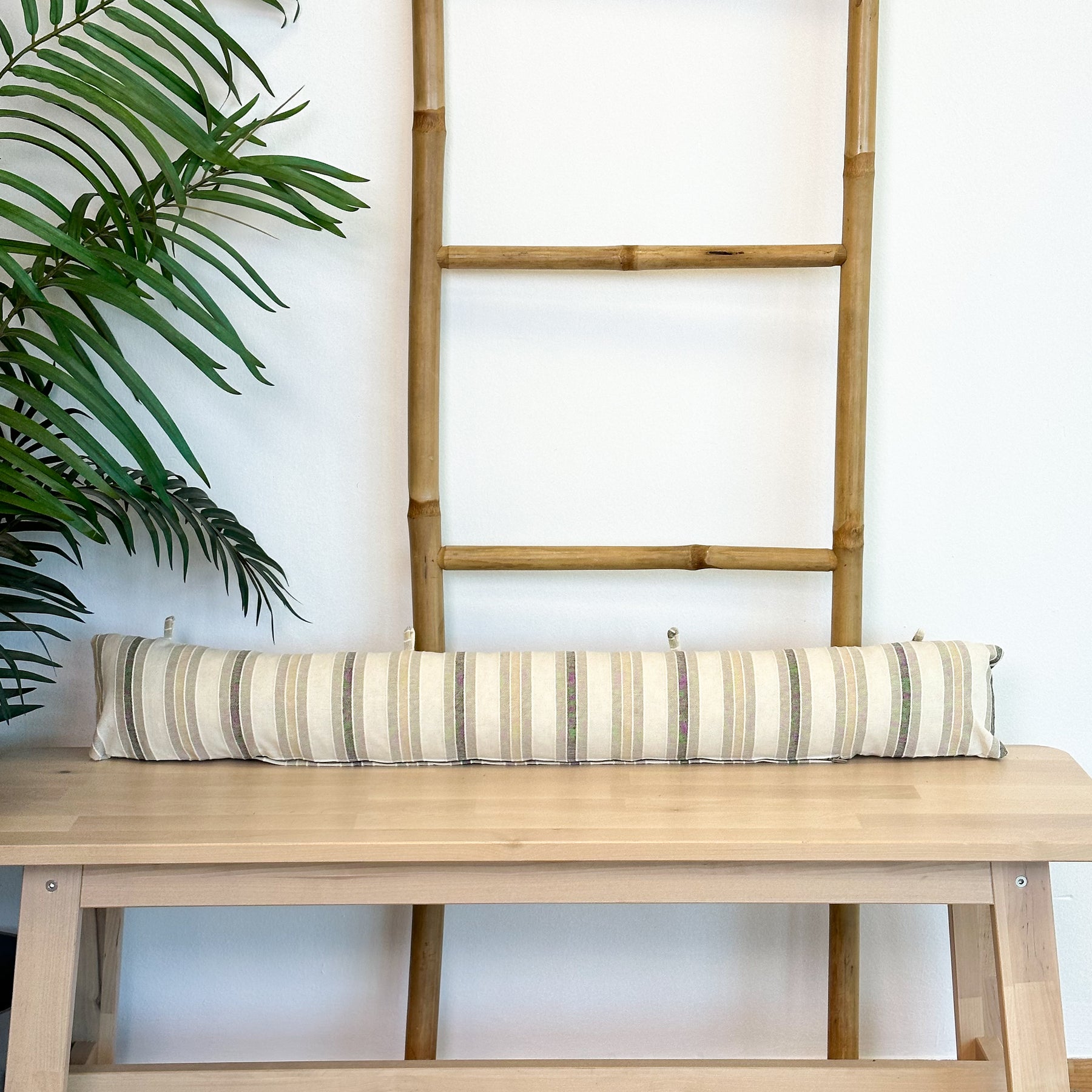 Cortavientos con relleno. Con pequeñas asas para colgar en la puerta. Con tejido con estampado a rayas en tonos beige y crudo. Para su correcto mantenimiento se aconseja lavarlo en frío y no utilizar secadora.
