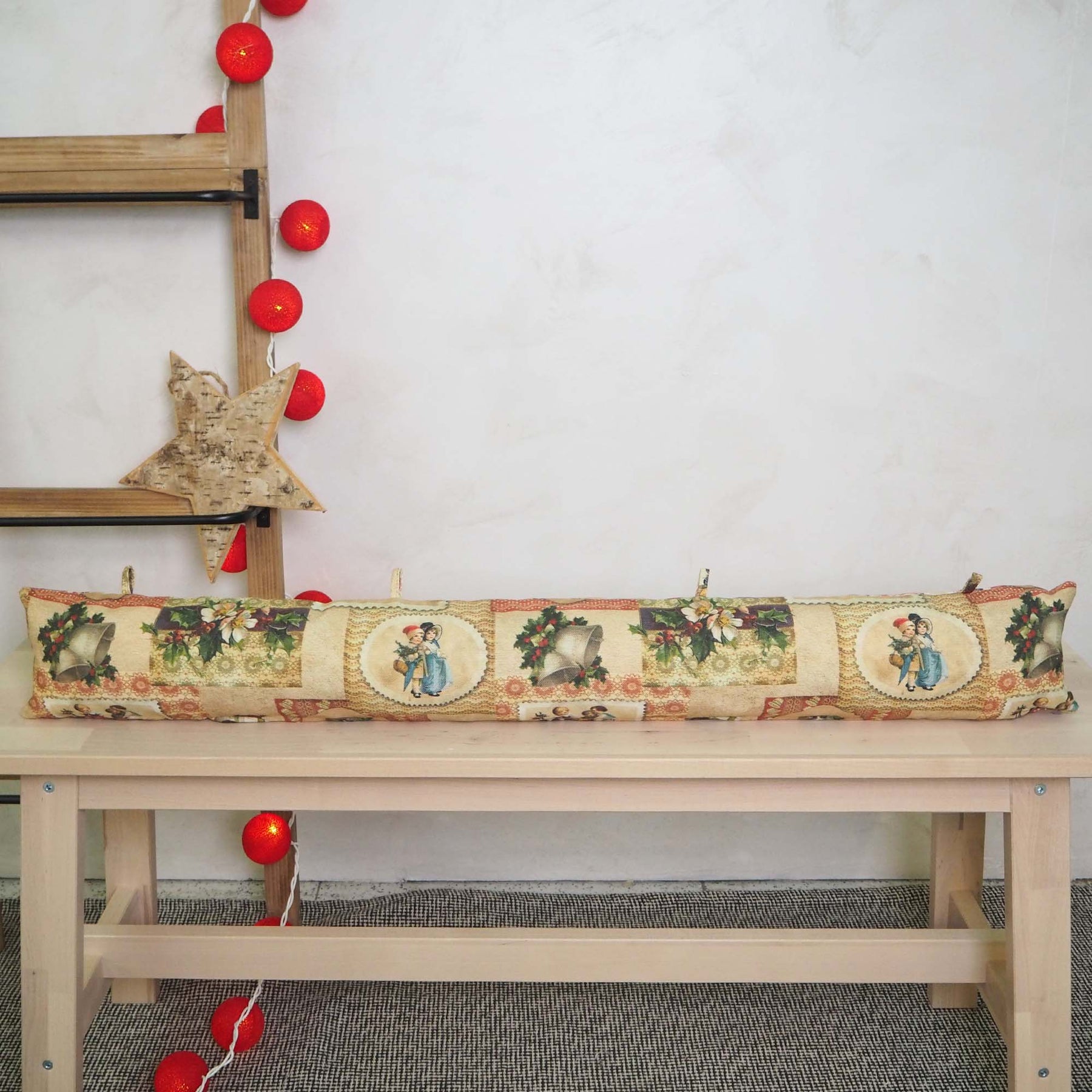 Cortavientos con relleno. Con pequeñas asas para colgar en la puerta. Con tejido fino con estampado navideño. Para su correcto mantenimiento se aconseja lavarlo en frío y no utilizar secadora.