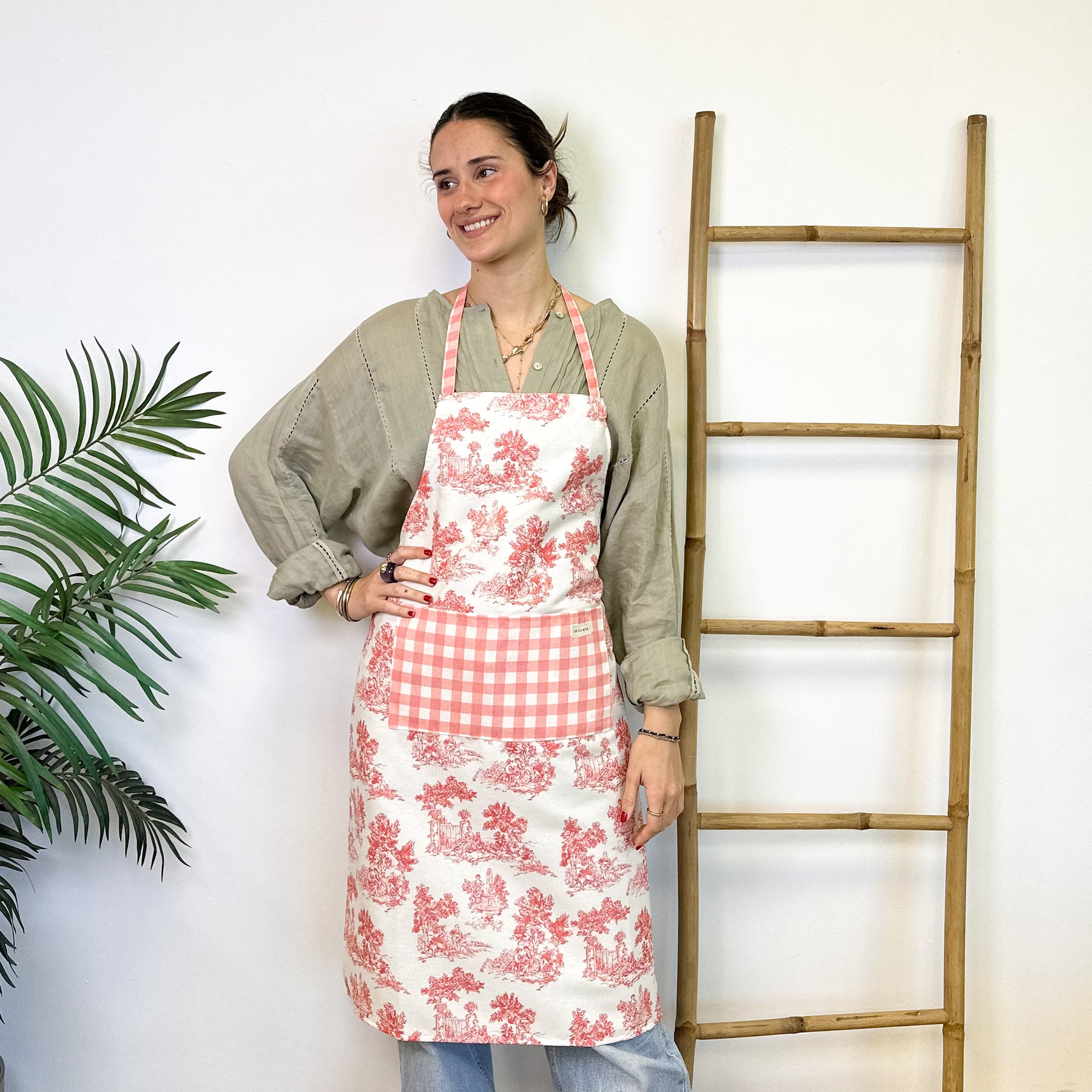 Delantal con bolsillo delantero. Con tejido con estampado de toile de jouy de color rosa combinado con estampado a cuadros vichy de color rosa en el bolsillo. Para su correcto mantenimiento se aconseja lavarlo en frío y no utilizar secadora.