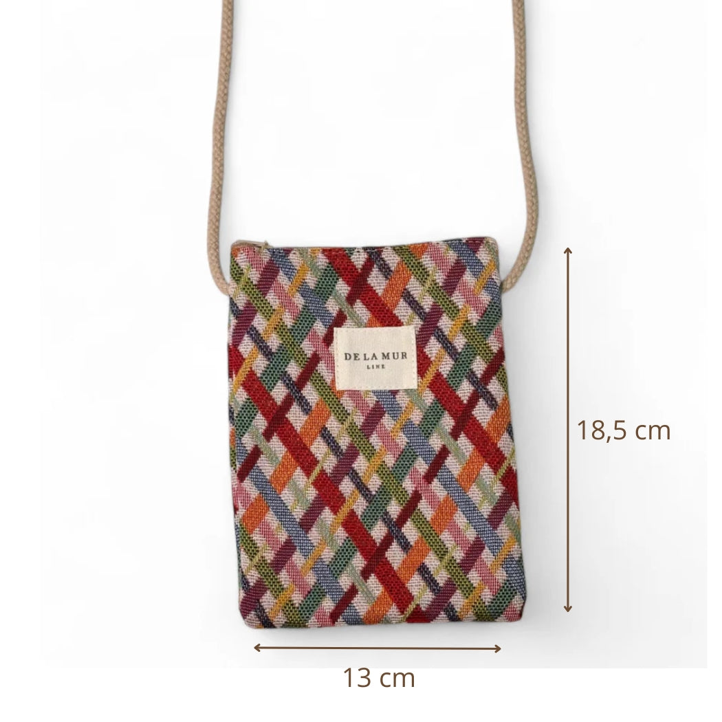Bolsito porta móvil para llevar tipo bandolera. Con cremallera en la parte superior y cordón largo de algodón de color beige. Con tejido grueso de jacquard con estampado geométrico multicolor. Cada articulo puede tener una variación en el estampado, dependiendo de donde se haya efectuado el corte de la pieza. Forrado de tejido grueso de color gris en la parte interior. Para su correcto mantenimiento se aconseja lavarlo en frío a mano y no utilizar secadora.