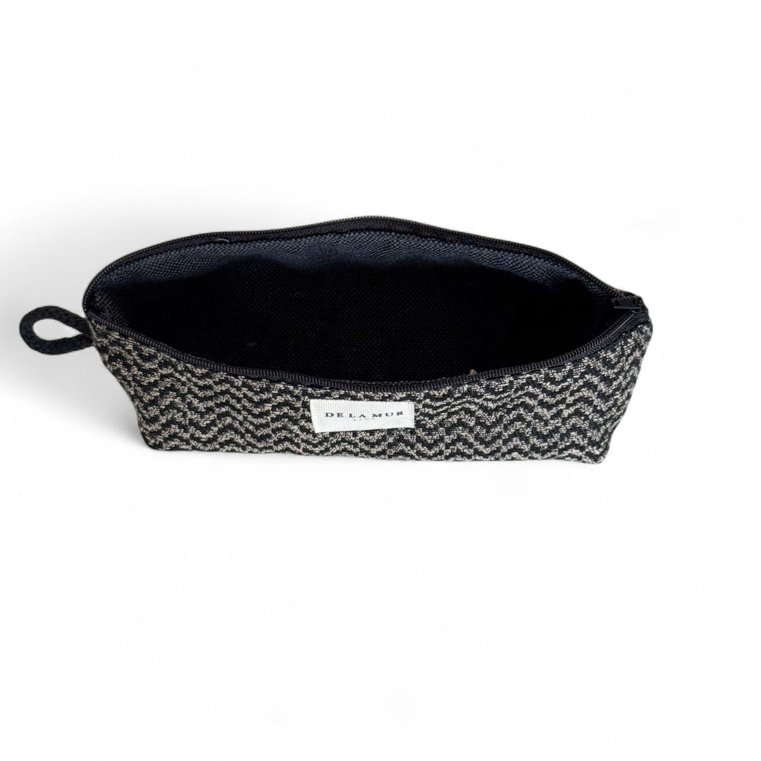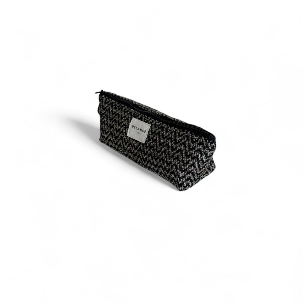 Estuche con cremallera en la parte superior. Con tejido grueso de jacquard con estampado tipo zigzag en negro y beige. Cada articulo puede tener una variación en el estampado, dependiendo de donde se haya efectuado el corte de la pieza. Forrado de tejido grueso de color gris en la parte interior. Para su correcto mantenimiento se aconseja lavarlo en frío a mano y no utilizar secadora.