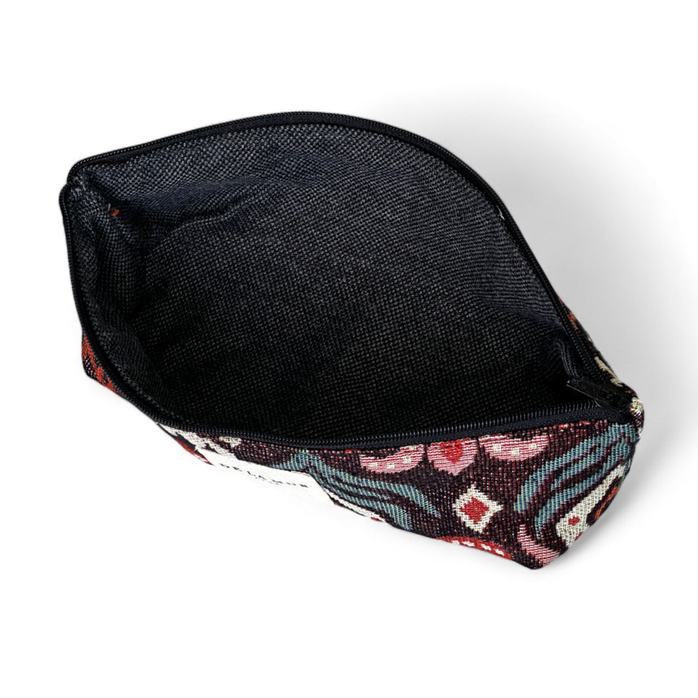 Estuche con cremallera en la parte superior. Con tejido grueso de jacquard con estampado étnico en tonos granates. Cada articulo puede tener una variación en el estampado, dependiendo de donde se haya efectuado el corte de la pieza. Forrado de tejido grueso de color gris en la parte interior. Para su correcto mantenimiento se aconseja lavarlo en frío a mano y no utilizar secadora.