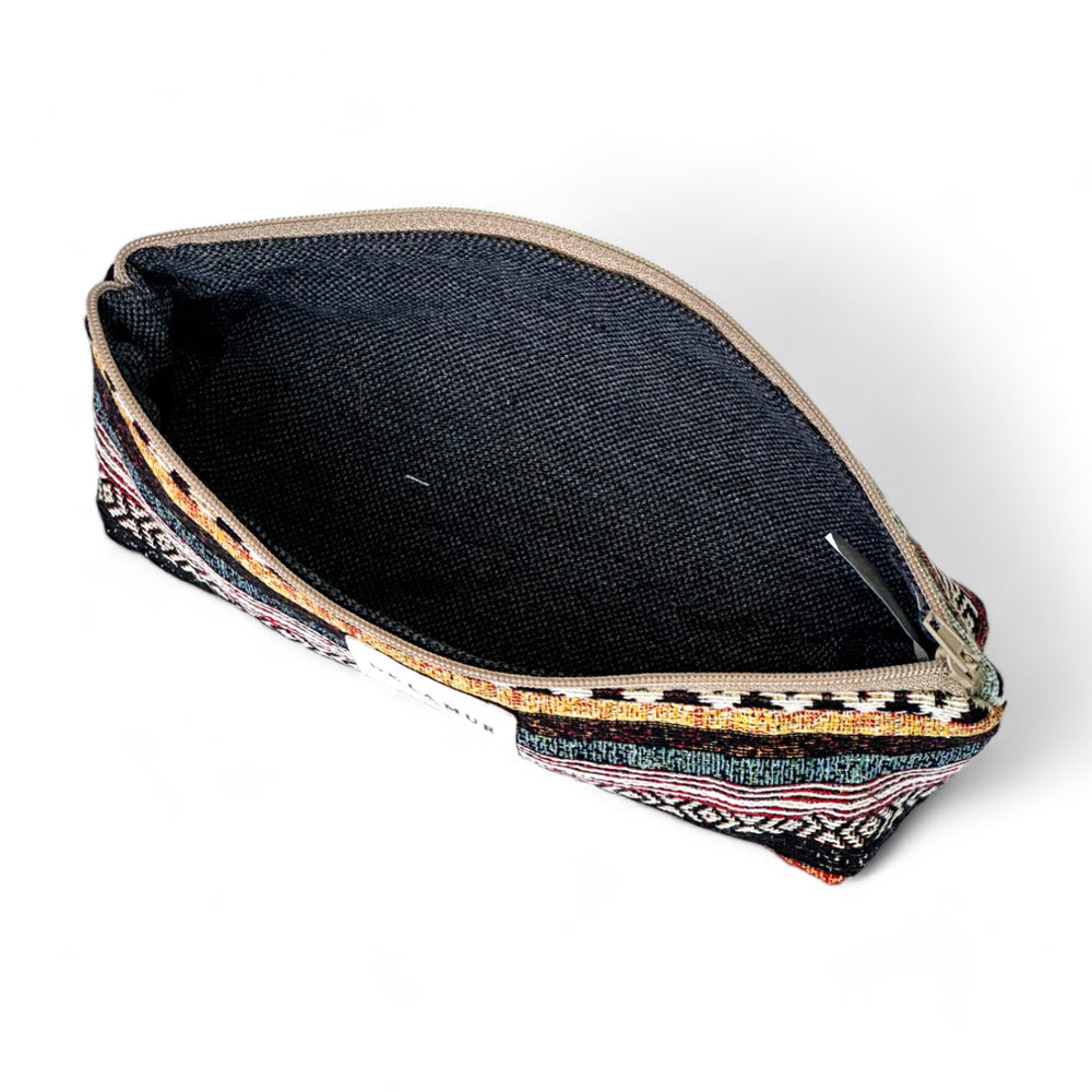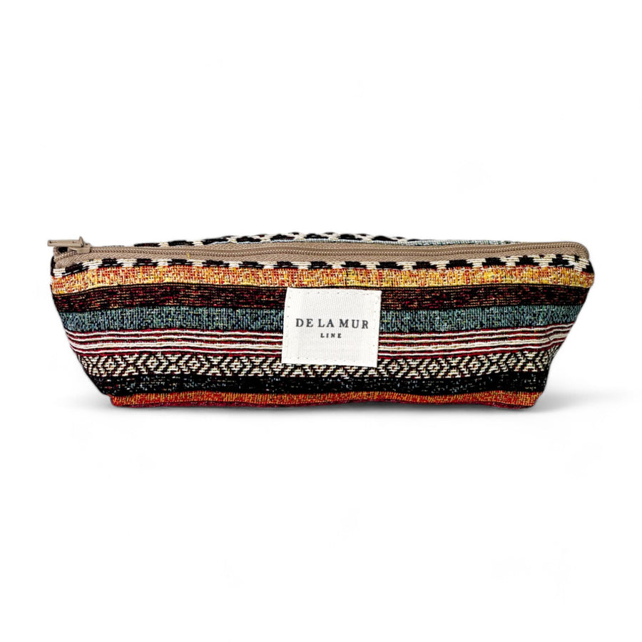 Estuche con cremallera en la parte superior. Con tejido grueso de jacquard con estampado a rayas horizontales multicolor. Cada articulo puede tener una variación en el estampado, dependiendo de donde se haya efectuado el corte de la pieza. Forrado de tejido grueso de color gris en la parte interior. Para su correcto mantenimiento se aconseja lavarlo en frío a mano y no utilizar secadora.
