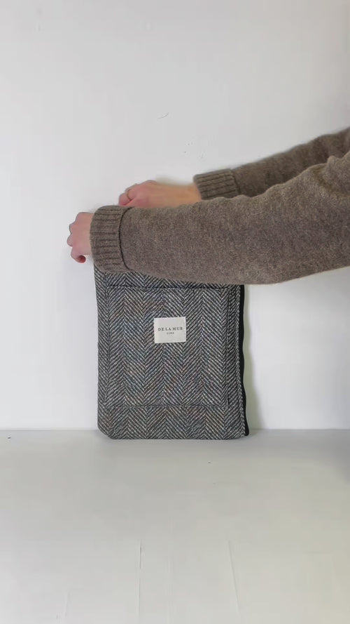Funda de ordenador portátil con cremallera. Bolsillo exterior con velcro. Con capa interior de espuma para proteger. Con un tejido fino de half-panama con estampado tipo espiga de color gris oscuro. Forrado de tejido grueso de color gris en la parte interior. Para su correcto mantenimiento se aconseja lavarlo en frío a mano y no utilizar secadora.