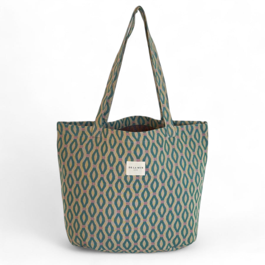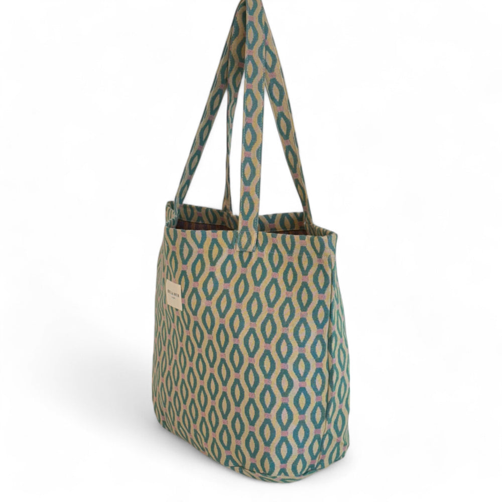 Bolsa shopper grande con asas para llevar al hombro. Con tejido grueso con estampado geométrico en tonos verde y rosa. Para su correcto mantenimiento se aconseja lavarlo en frío a mano y no utilizar la secadora.