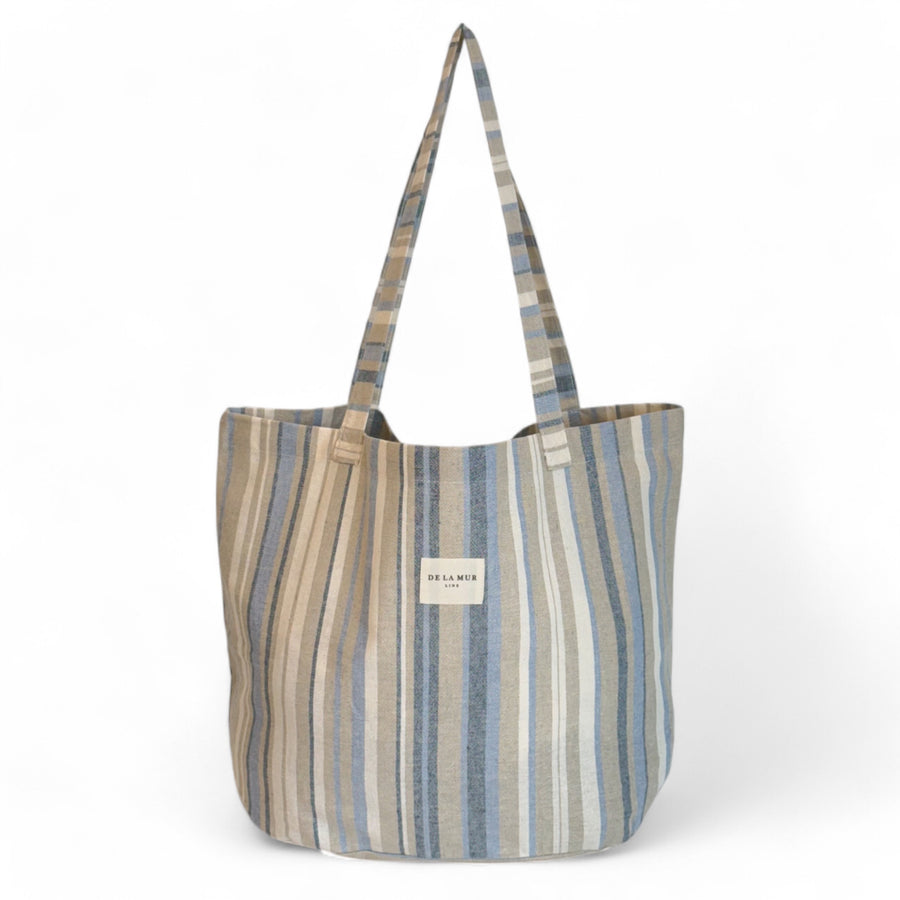 Bolsa shopper grande con asas para llevar al hombro. Con tejido fino de half-panama con estampado a rayas en tonos azules, beige y crudo. Para su correcto mantenimiento se aconseja lavarlo en frío a mano y no utilizar la secadora.